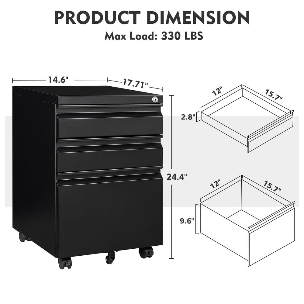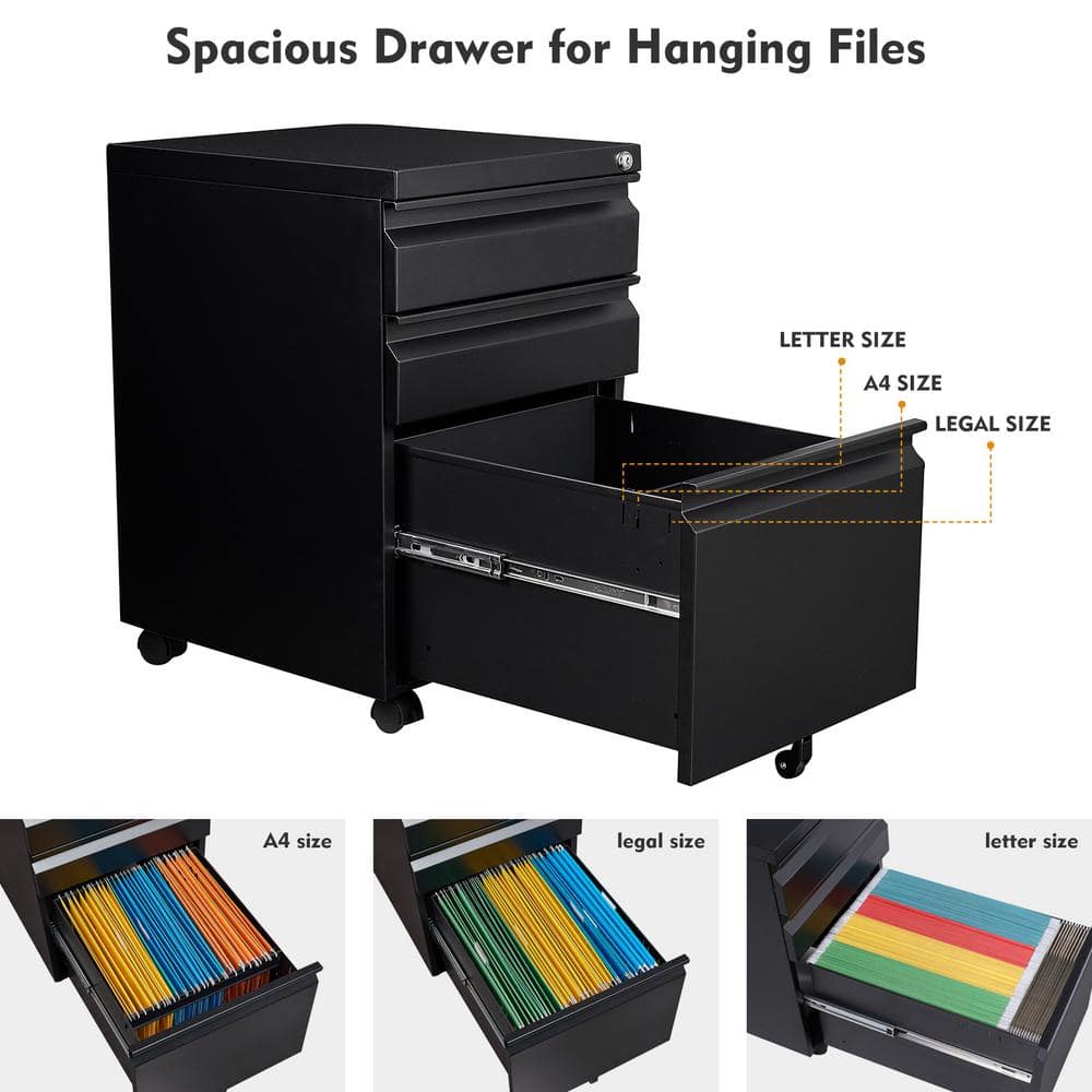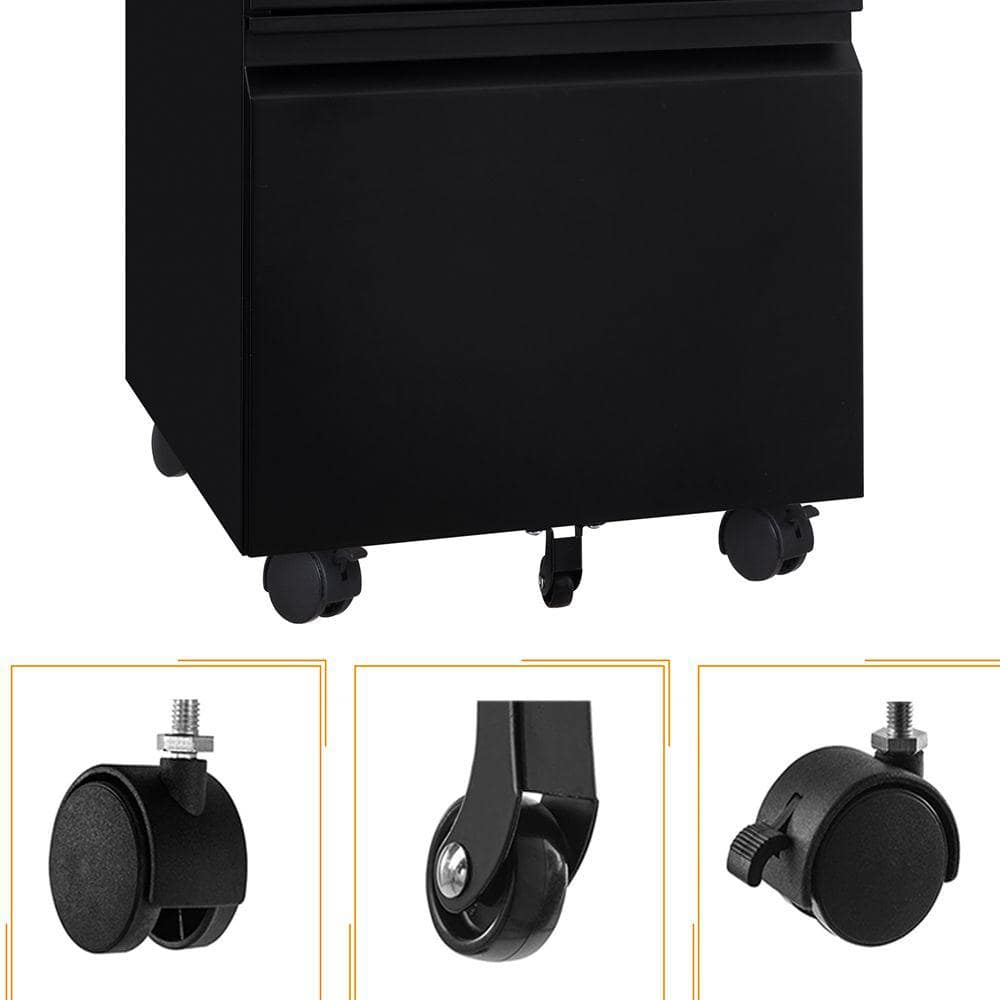 Keep your documents secure and organized with the Mlezan Black Mobile 3-Drawer File Cabinet. Designed with durable metal construction, this cabinet features full-extension silent rails and a lock to ensure confidential storage. Equipped with easy-to-move swivel casters and a high load capacity, it excels in both functionality and style for any office or home setting.