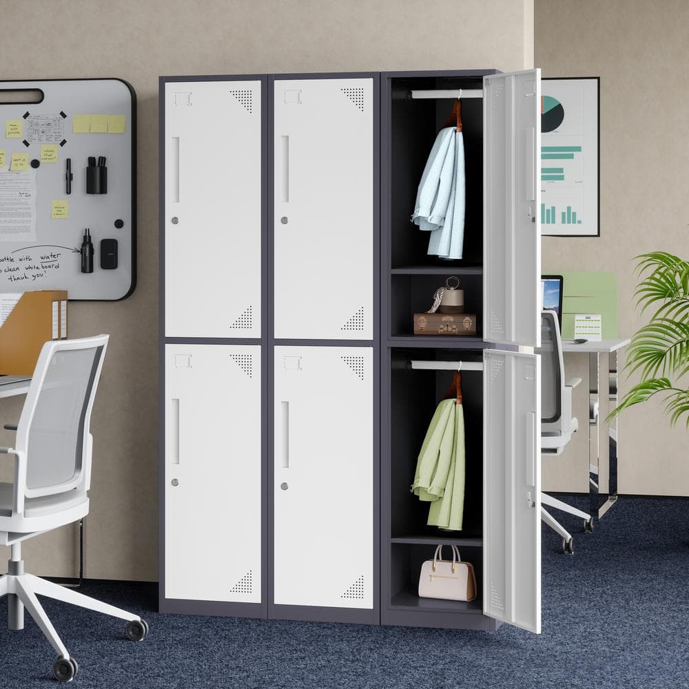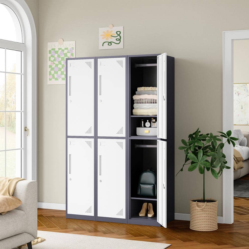 The Mlezan Double Tier Metal Locker Cabinet offers robust security and ample storage in a sleek grey white finish. Constructed from durable 24-gauge steel, this 71-inch tall locker is perfect for gyms, schools, or office spaces where secure storage is essential. Equipped with lockable doors and keys, it ensures your belongings are safely stored.