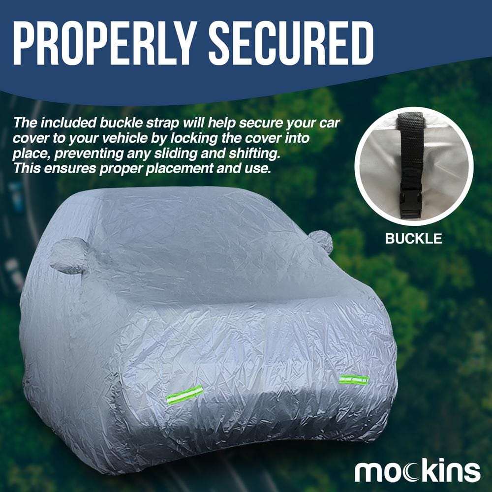 Transform your vehicle's static presence into a statement of sophistication and safety with the Mockins Water-Resistant SUV Cover. Its luminous silver finish whispers elegance while standing as a silent guardian against the elements. The reflective strips provide a night-time shimmer, turning your vehicle into a beacon of visibility. Imagine this cover as a layer of polished armor that effortlessly enhances both the aesthetics and security of your SUV, making it an indispensable companion to luxurious, worry-free living.