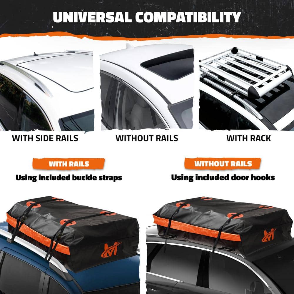 Q: Can this cargo bag fit any vehicle? A: Most vehicles can easily accommodate the cargo bag with its flexible attachment options, including door hooks that are helpful when there are no side rails or crossbars.