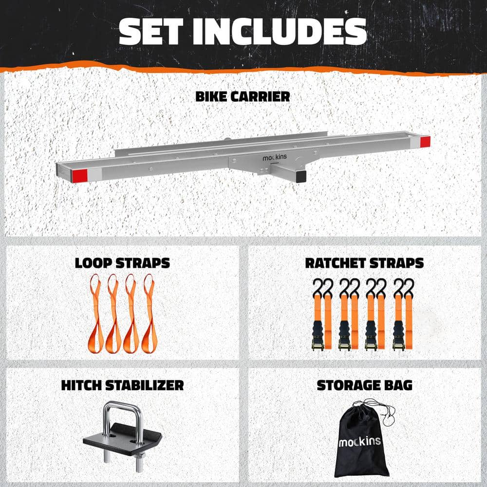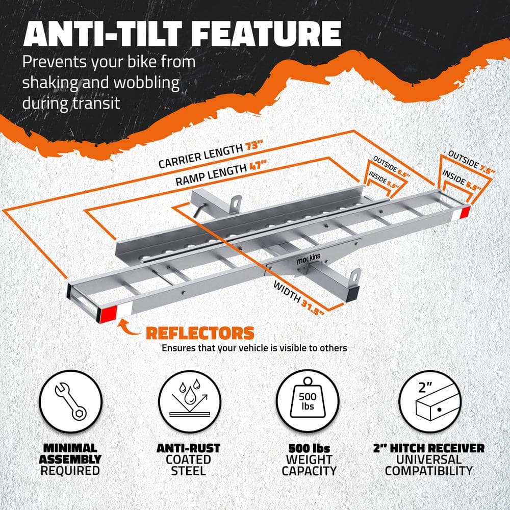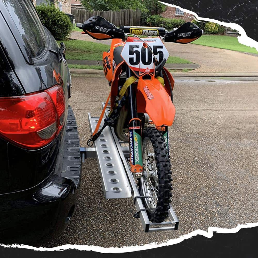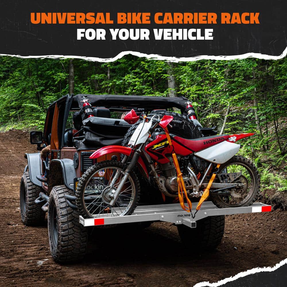 The Mockins Heavy-Duty Steel Hitch Mount Dirt Bike Carrier offers a robust transportation solution for your bike, with a 500 lb capacity and convenient loading ramp. Designed for vehicles with a 2-in hitch receiver, it includes straps and a hitch stabilizer to ensure a secure and smooth journey.