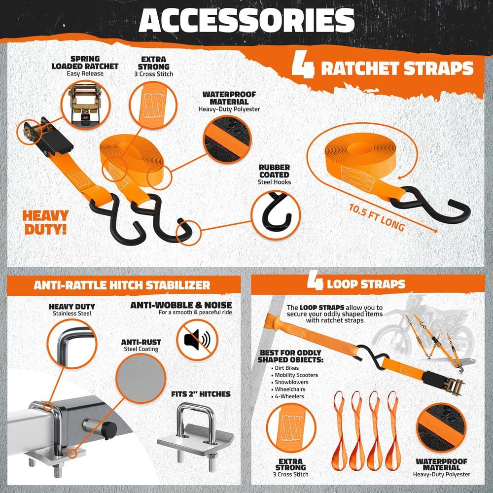 Q: How do I ensure the dirt bike stays secure during transport? A: The carrier comes with four heavy-duty ratchet straps and four additional loop straps to keep your bike in place.