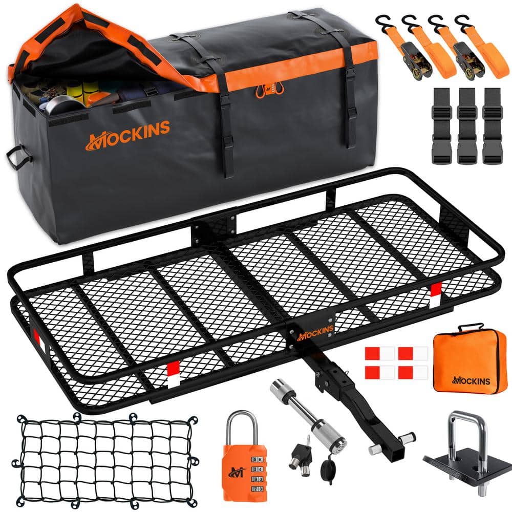 Effortlessly transport your essentials with the Mockins Hitch Mount Cargo Carrier. This robust steel carrier features a 500 lbs capacity and includes a 16 cu. ft. waterproof cargo bag, ideal for all weather conditions. Designed for vehicles with a 2-inch hitch receiver, its foldable shank and 2-inch raise ensure both compact storage and enhanced ground clearance.