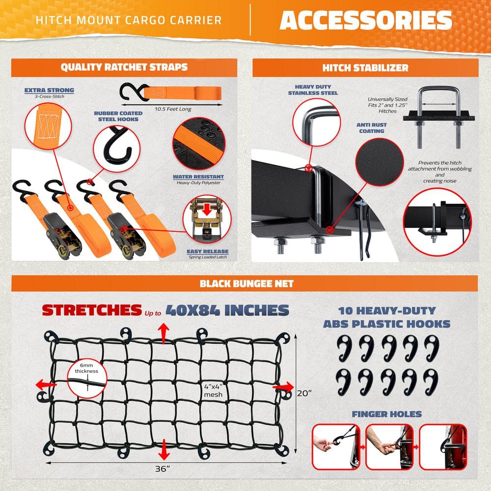 Q: How easy is the installation process? A: The cargo carrier easily fits into a 2-inch hitch receiver and includes all necessary hardware for quick installation, taking about 15-20 minutes using basic tools.