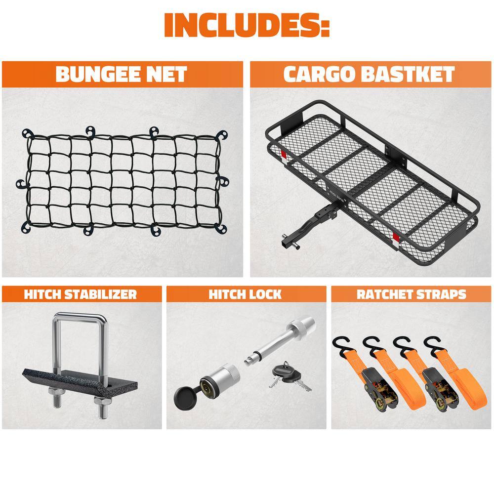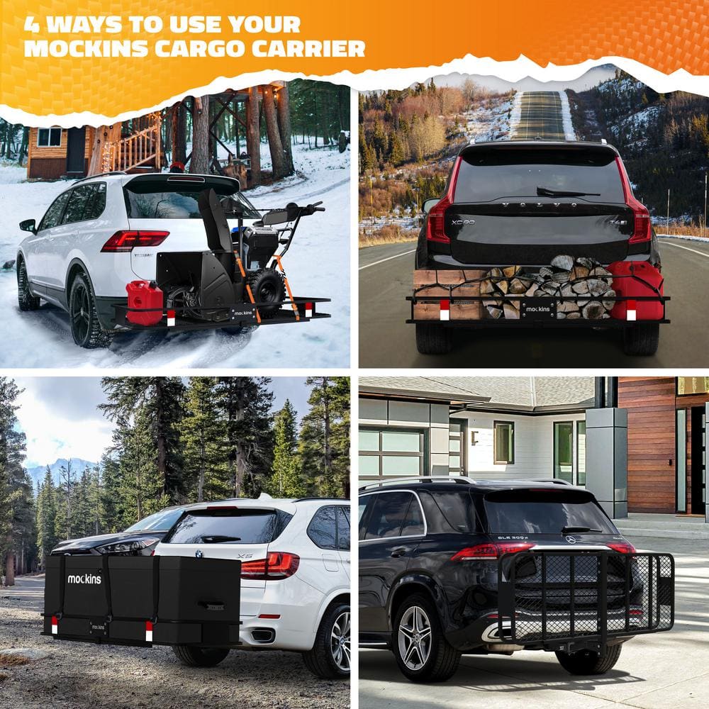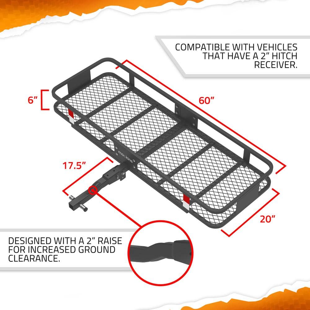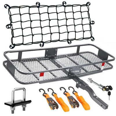 Enhance your travel experience with the Mockins Rustproof Cargo Carrier. This robust 60x24x6 inch hitch mount basket offers a 500 lbs capacity for versatile hauling, while rust-resistant steel construction ensures durability in any weather. With convenient foldable design and included accessories like ratchet straps, freight never has to be a hassle again.