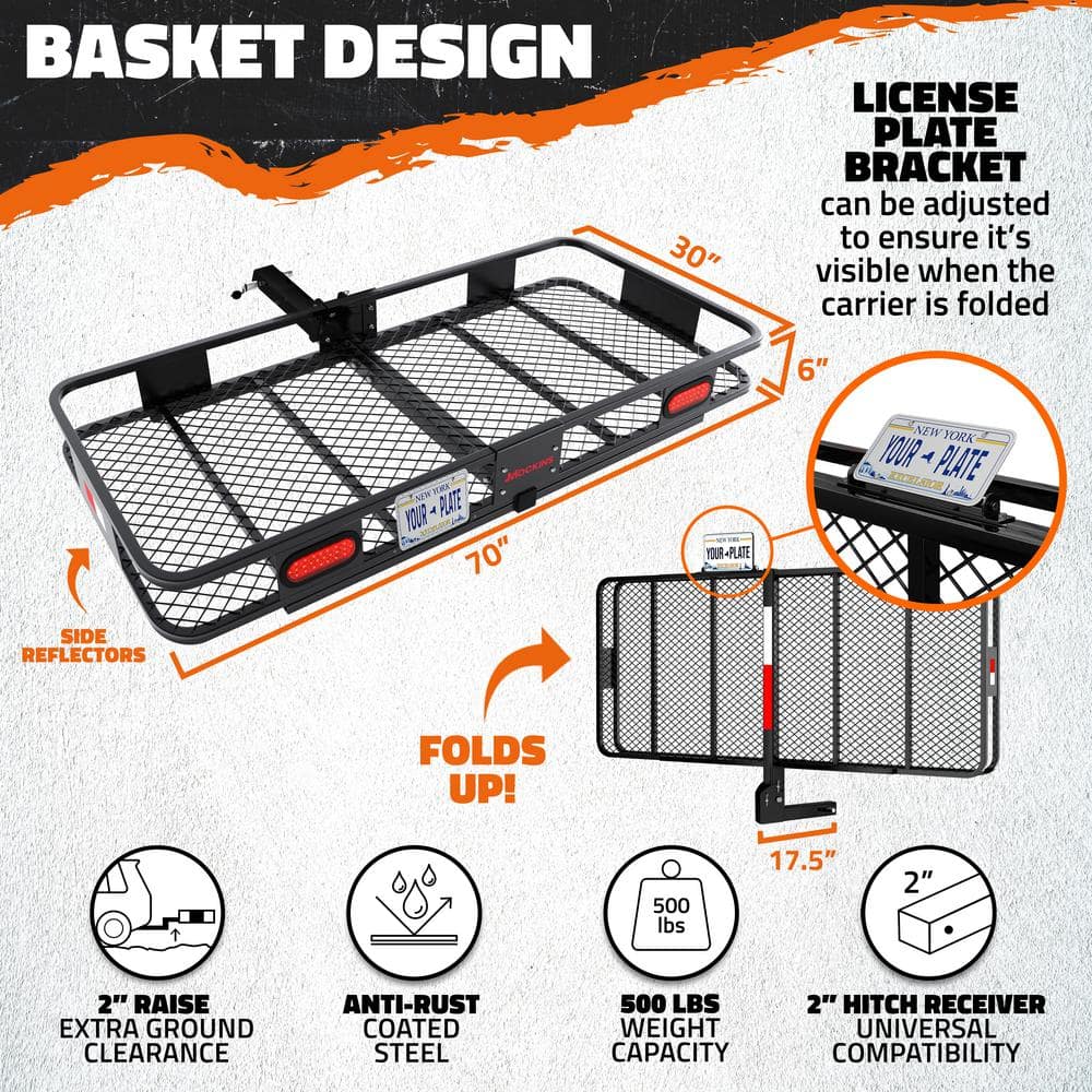 Q: Can the carrier be folded up when not in use? A: Yes, the hitch cargo basket can be folded vertically to save space when not loaded.