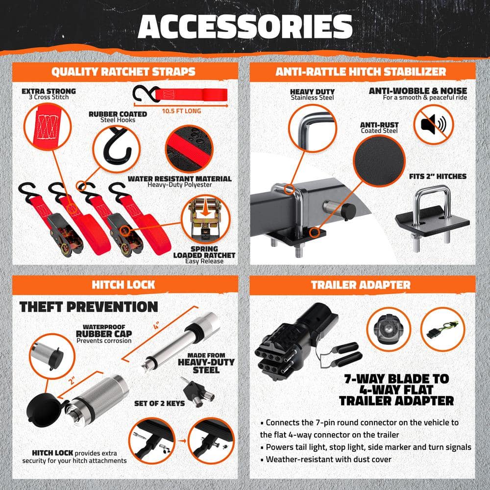 Bag Lock,Buckle Straps,Cargo Bag,Cargo Net,Hitch Lock,Hitch Stabilizer,Installation Hardware,Ratchet Straps,Reflective Strips,Storage Bag