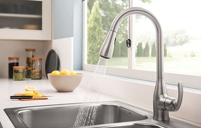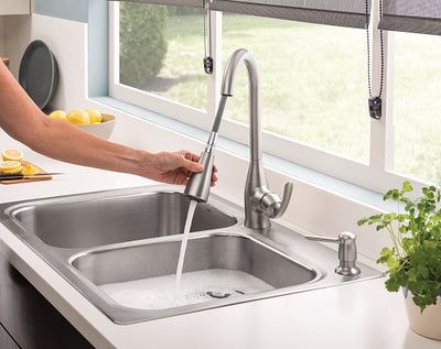 Constructed from sturdy 18-gauge stainless steel, the Kelsa sink and faucet combination provides plenty of space for washing dishes, while the large bowl depth ensures it's easy to accommodate tall pitchers or deep pots. Plus, its wear-resistant finish stands up to daily usage. Kelsa also comes with a transitionally styled pulldown faucet in Moen's Spot Resist stainless finish, a coordinating soap dispenser, and 2 drain assemblies.