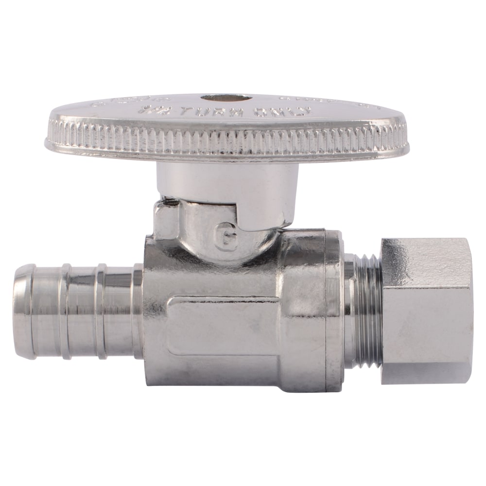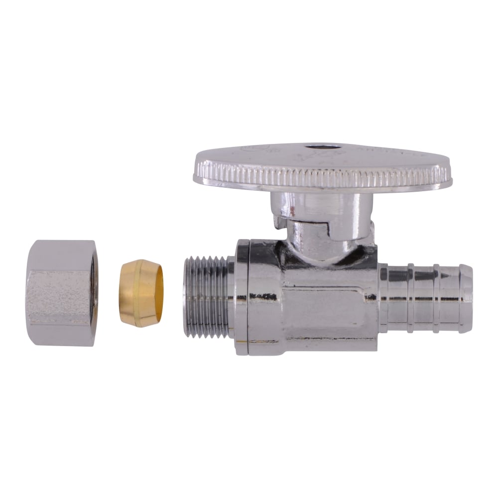 Quarter-turn straight stop valve that connects 1/2-in PEX barb to a 3/8-in OD compression outlet for fast shut-off to fixtures. Built from lead-free, chrome-plated DZR brass for durability and corrosion resistance, ideal for toilets, faucets, and dishwashers.
