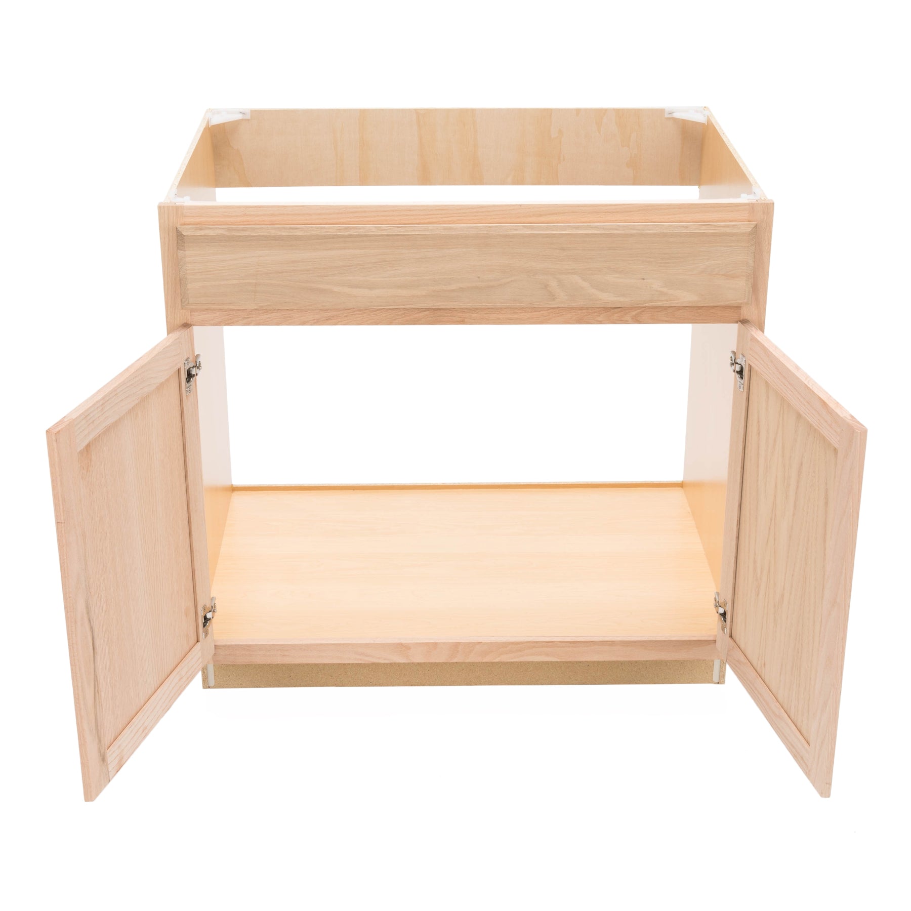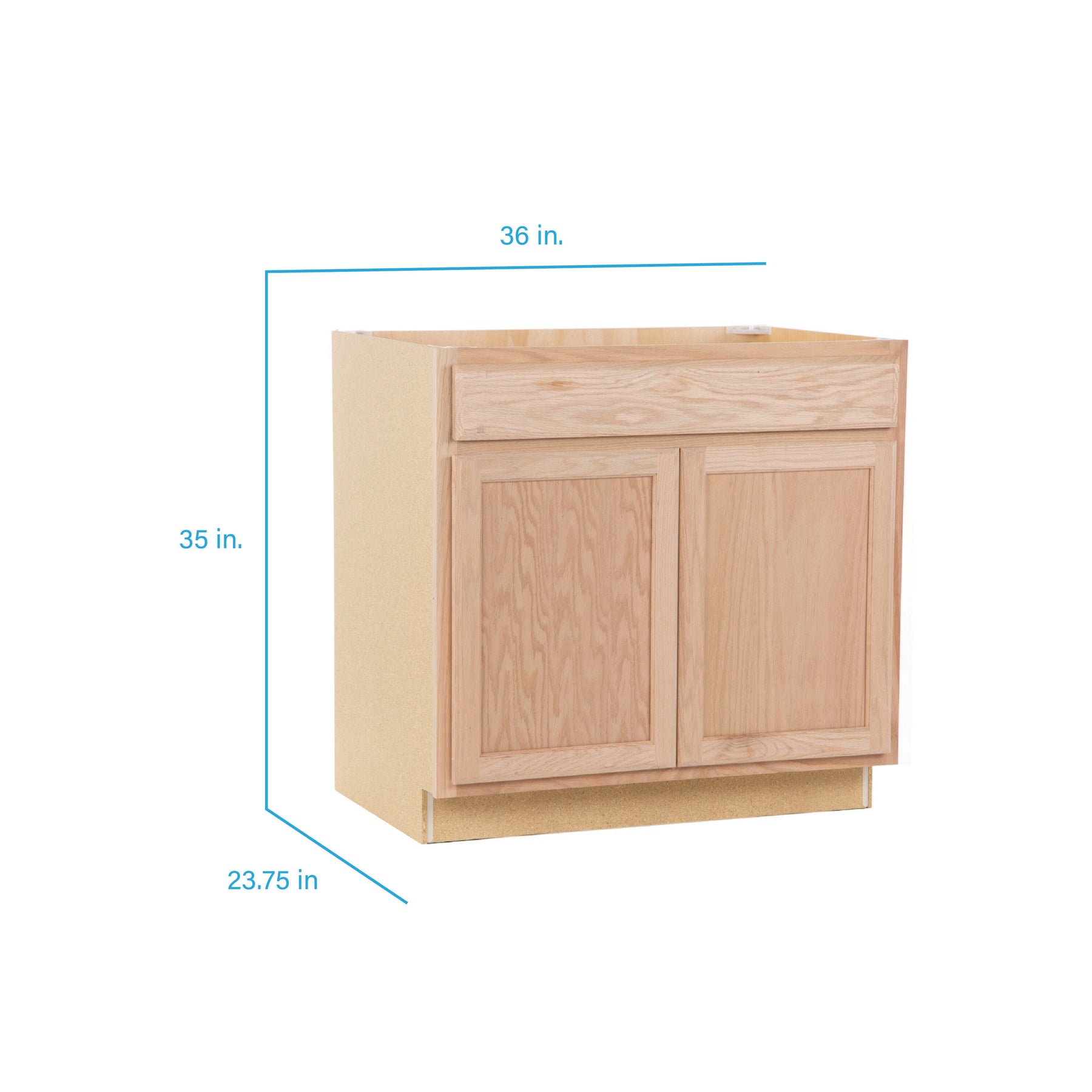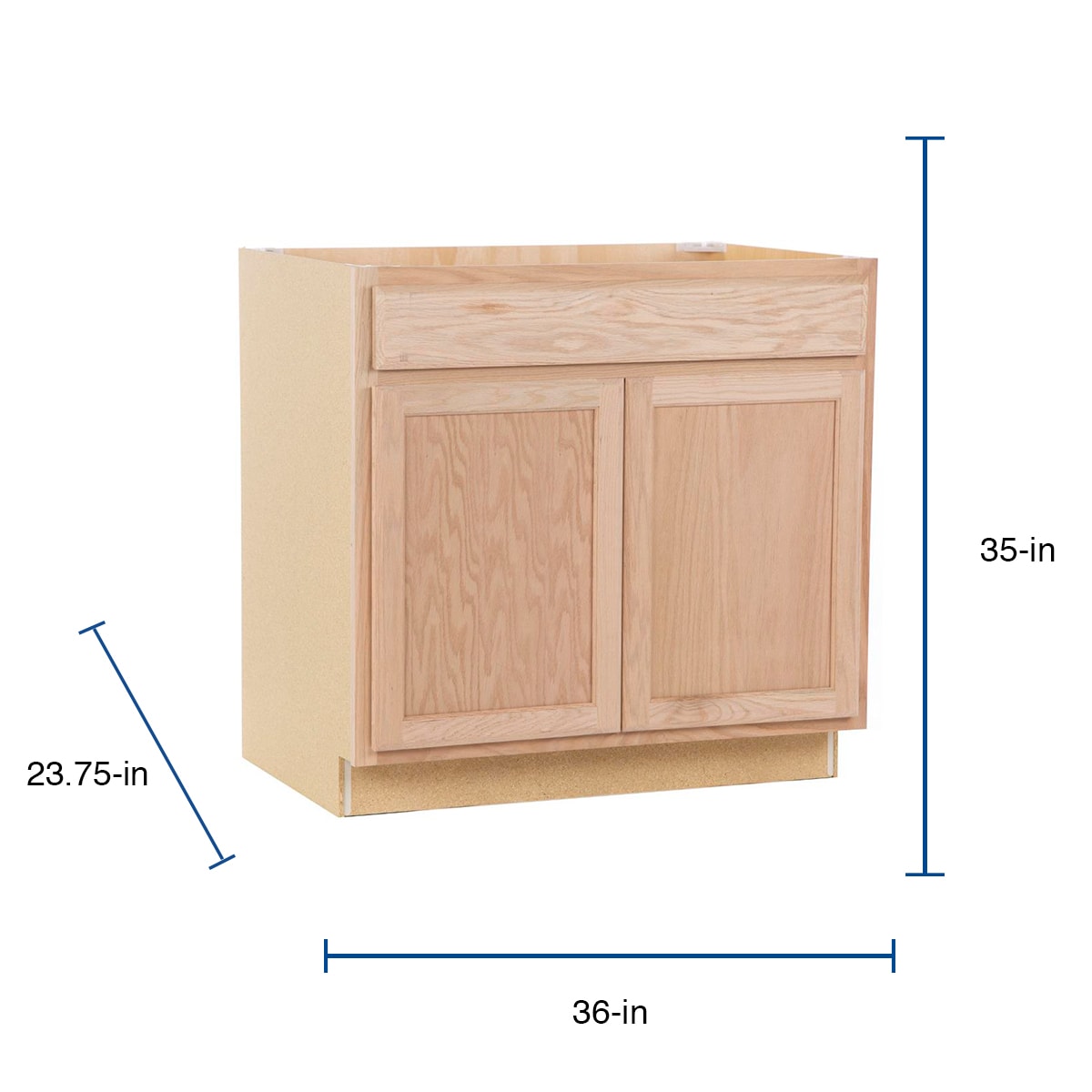 This fully assembled Project Source Oak Brook sink base cabinet delivers dependable storage and a clean, unfinished oak look you can paint or stain to match any kitchen or laundry room. A solid wood face frame with flat-panel square doors provides durable, transitional style sized at 36-in W x 35-in H x 23.75-in D.