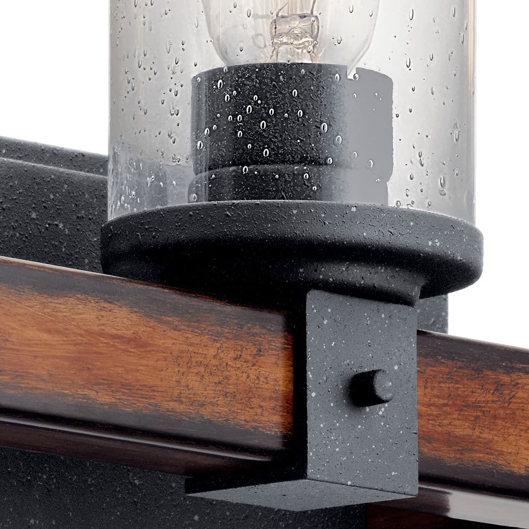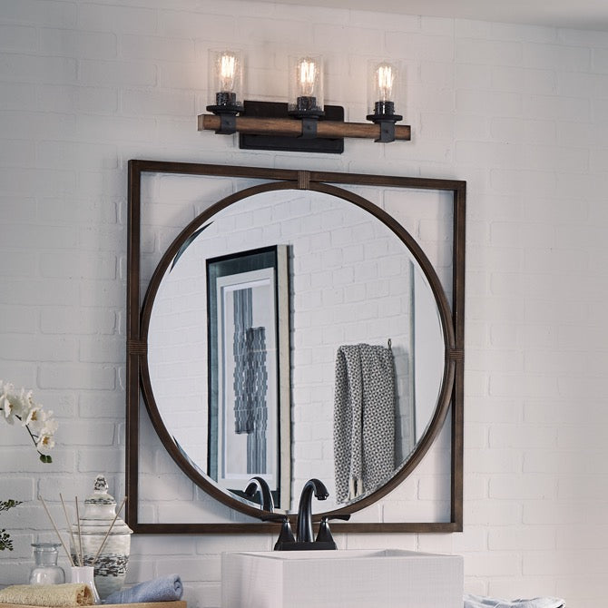 A rustic-meets-industrial 3-light vanity fixture featuring a distressed black metal finish with warm wood tones and clear seeded glass shades. Designed to elevate bathroom spaces with vintage charm and bright, even illumination.