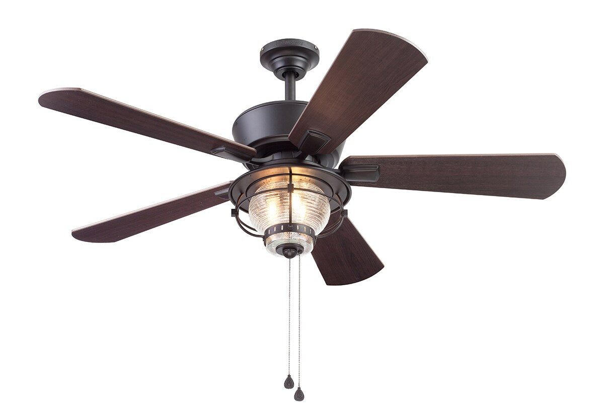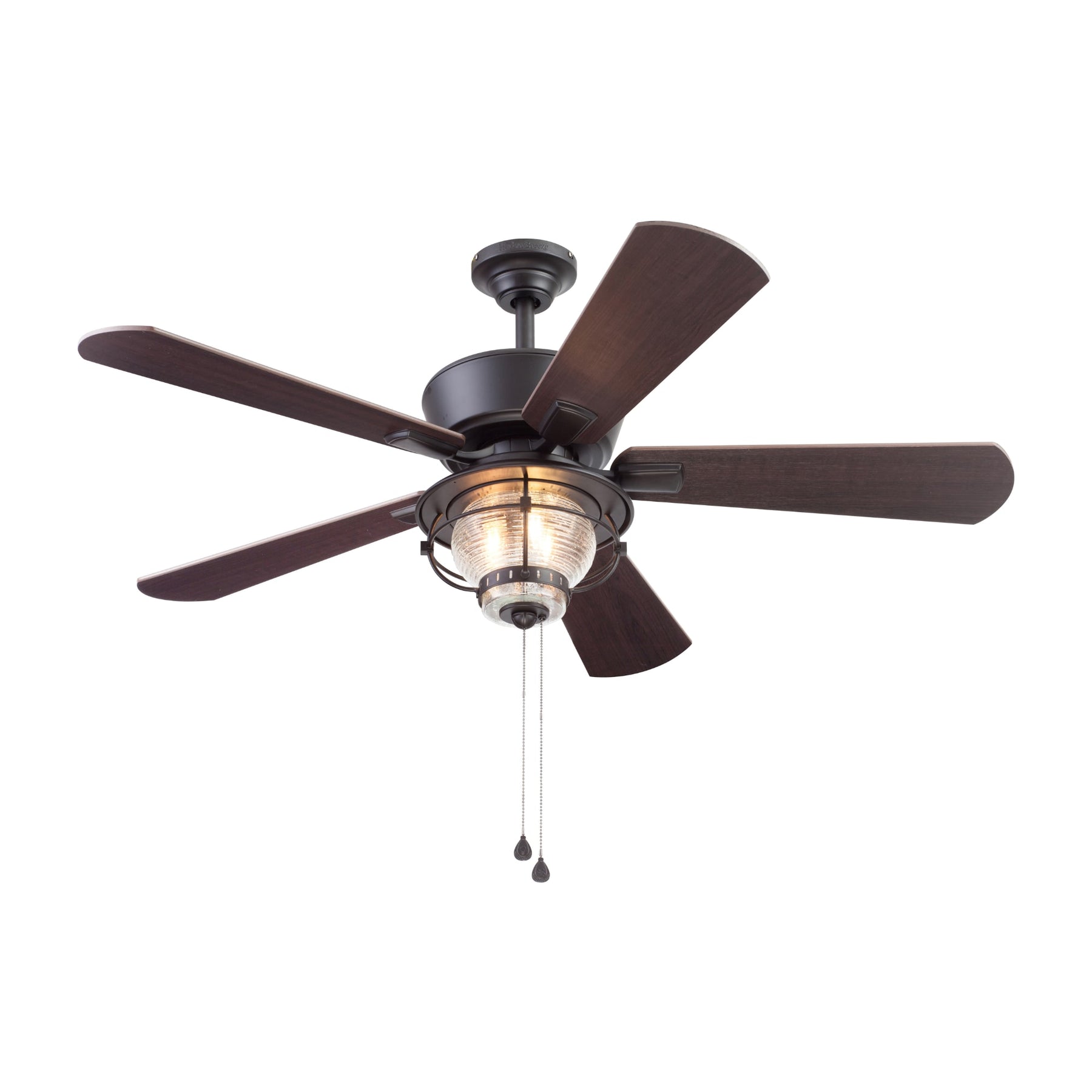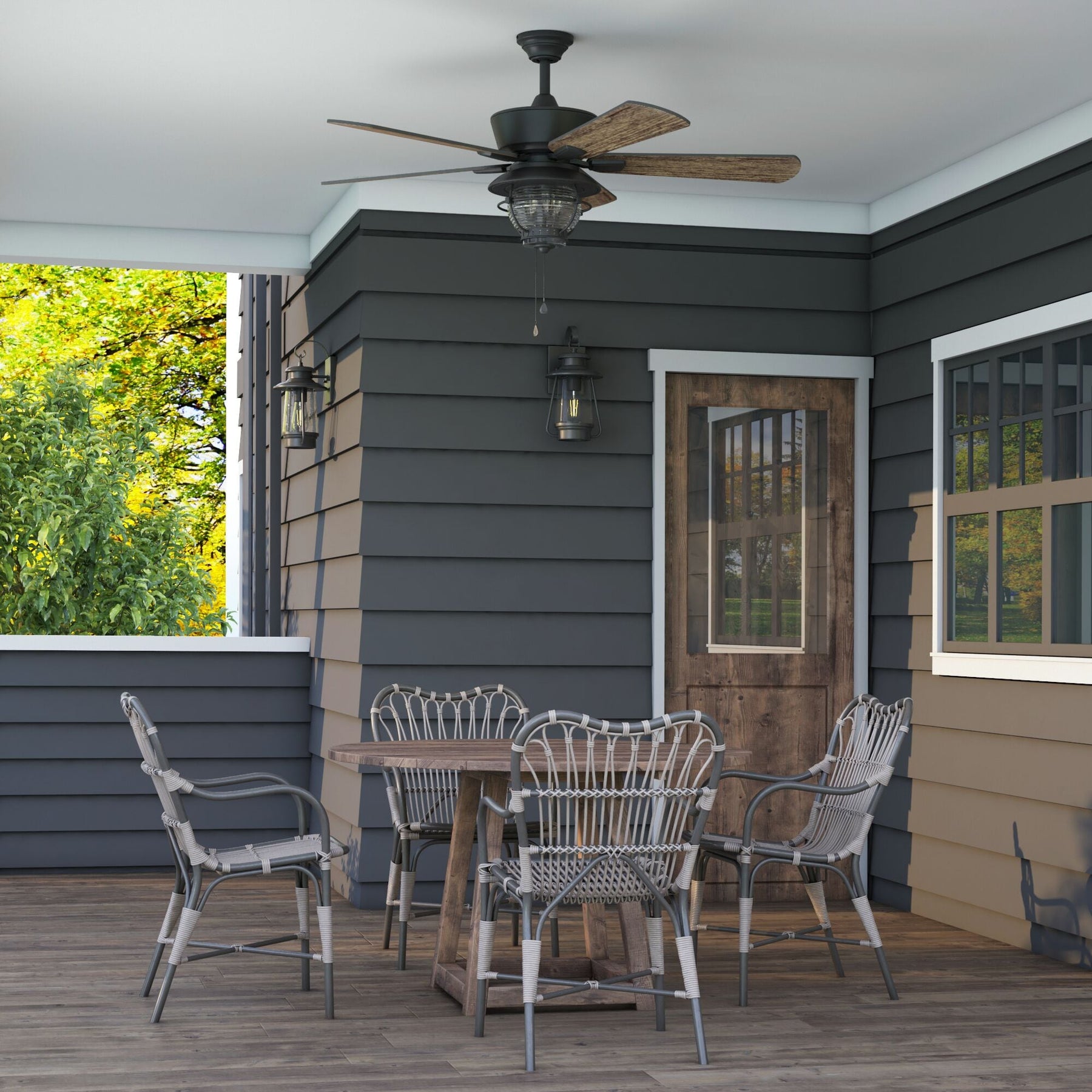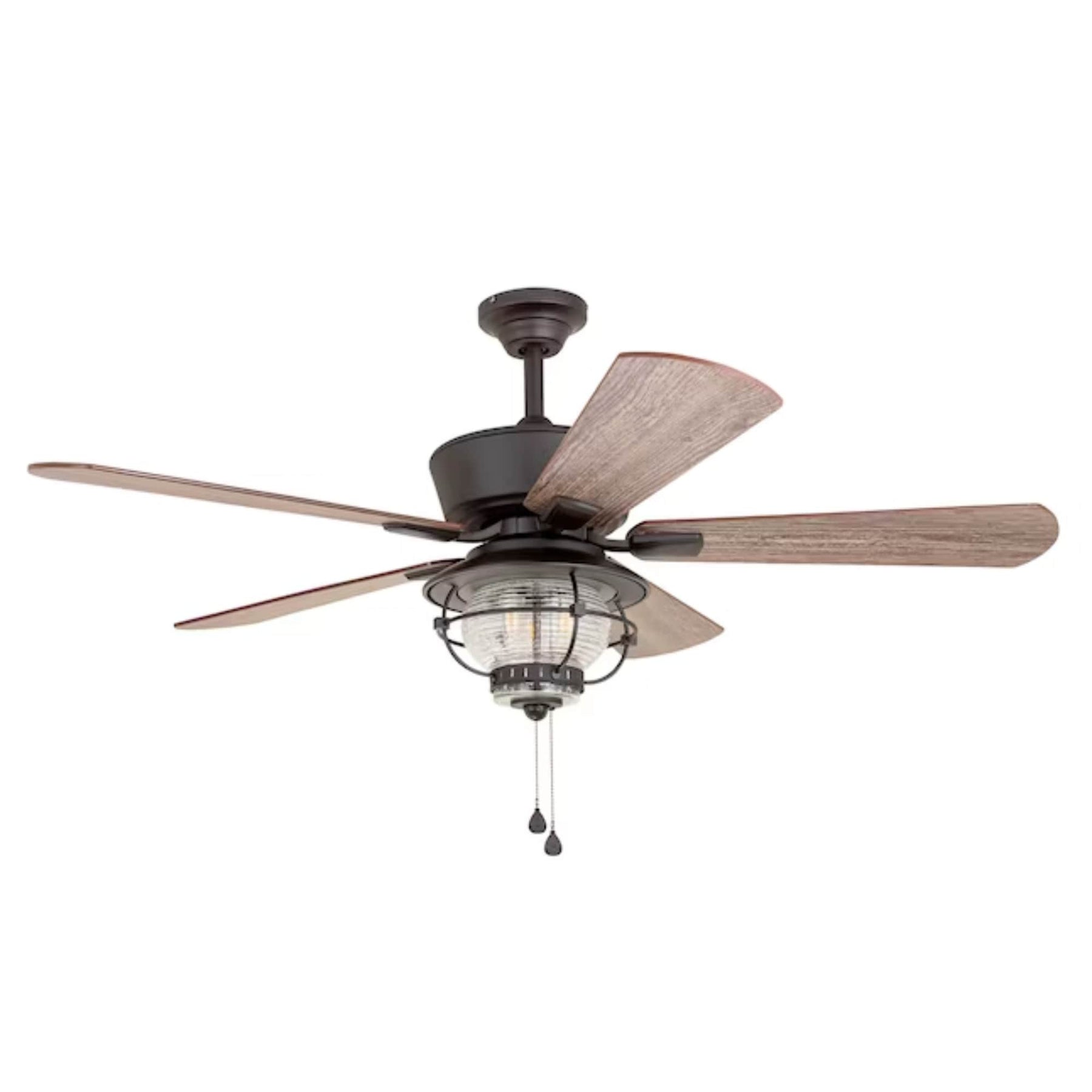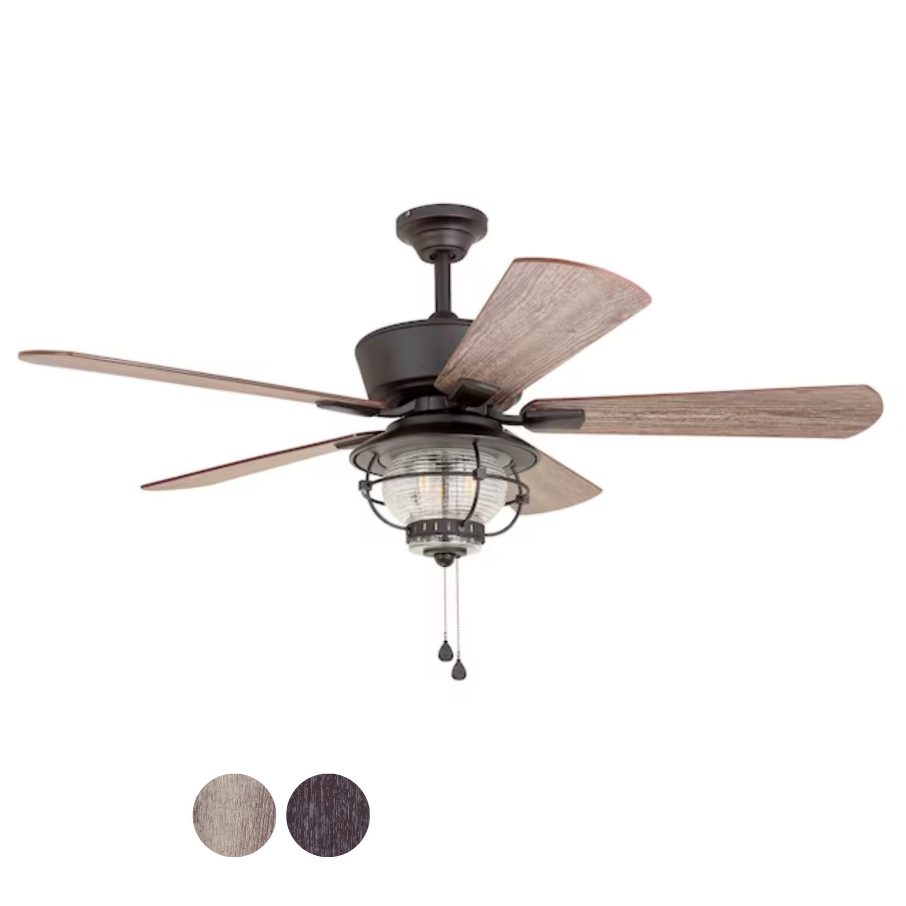 A damp-rated 52-inch ceiling fan designed for covered outdoor or indoor spaces, the Merrimack II delivers stylish farmhouse appeal and reliable airflow up to 400 sq. ft. Its seeded-glass lantern light kit includes three dimmable LED bulbs, and the 5 reversible blades offer Driftwood or Auburn finishes to suit your decor.