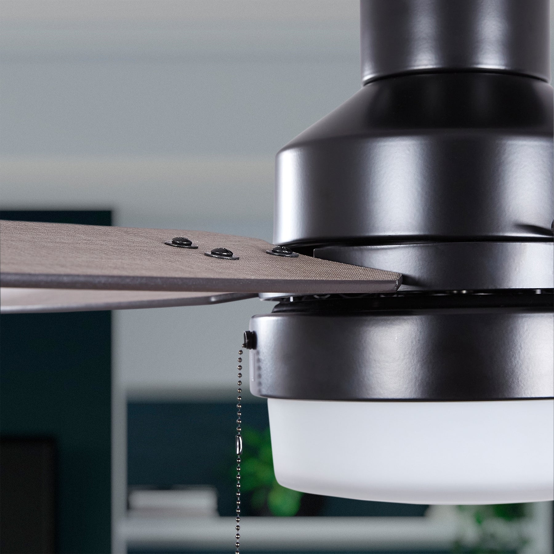 Port Haven’s matte black finish and streamlined silhouette bring a tailored calm to intimate rooms and covered patios. The frosted glass globe lends a soft, diffused glow, while reversible blades shift the mood from rustic willow to refined greyed walnut. Style it over a reading nook or breakfast area to anchor the space with quiet sophistication. It’s an everyday luxury that balances comfort, proportion, and polish.