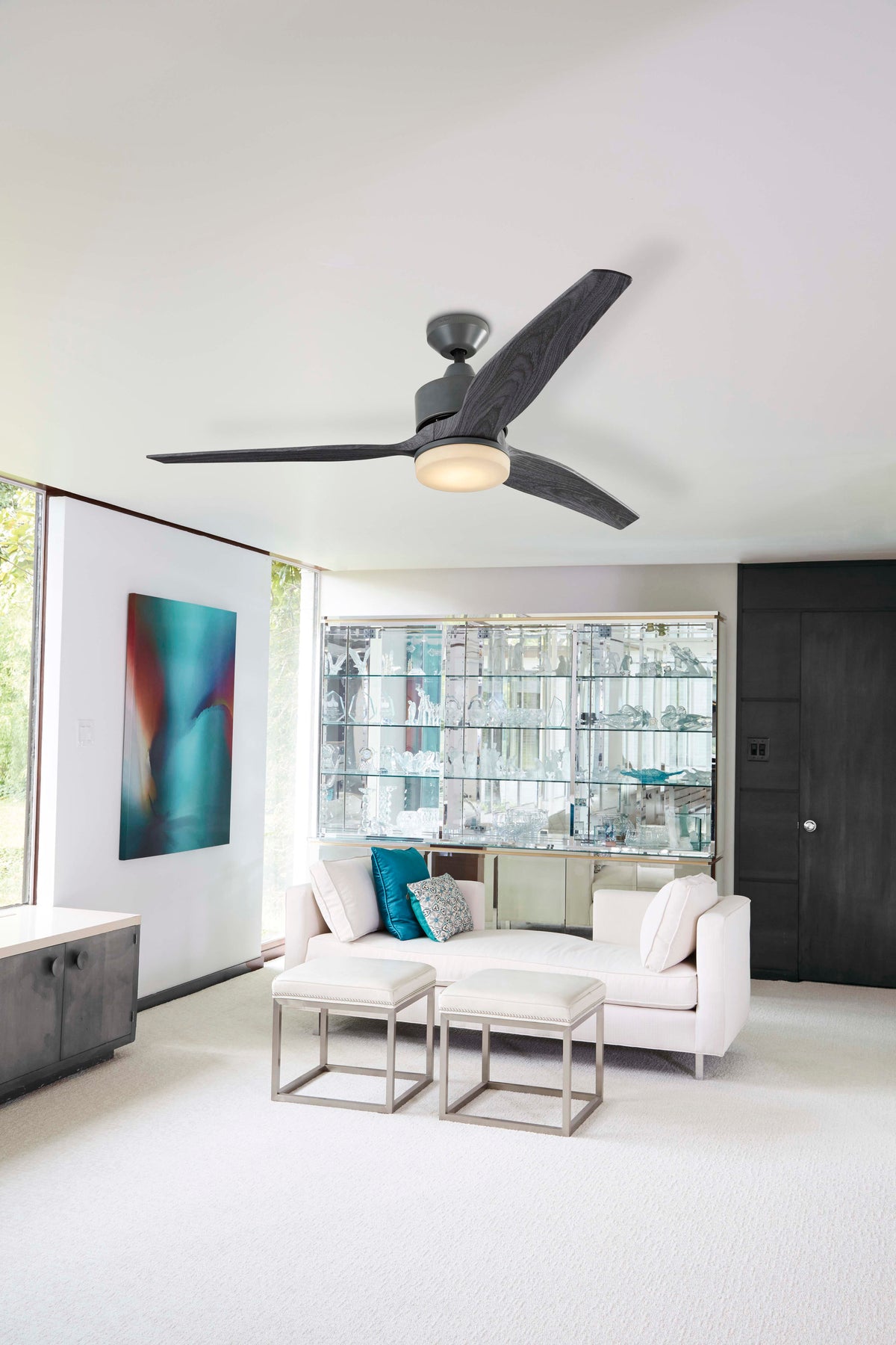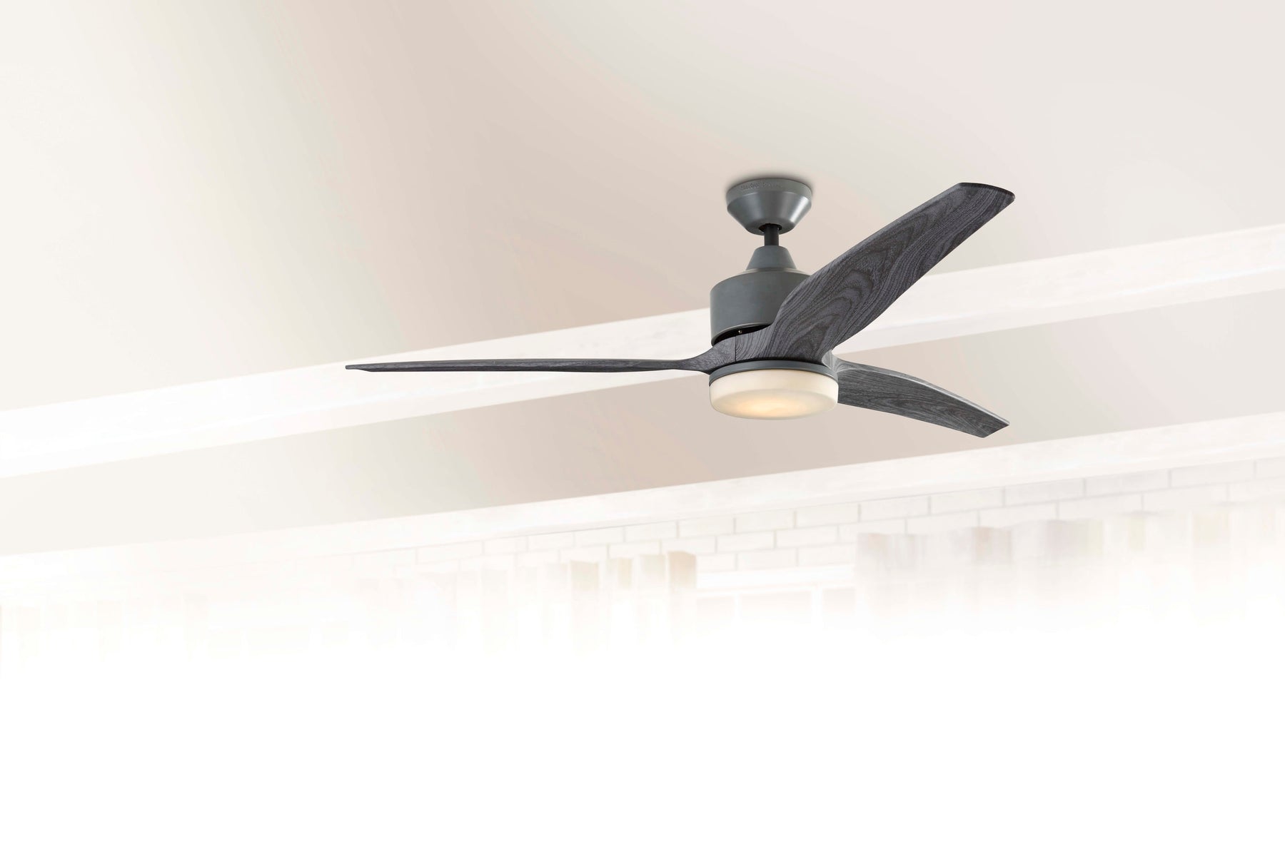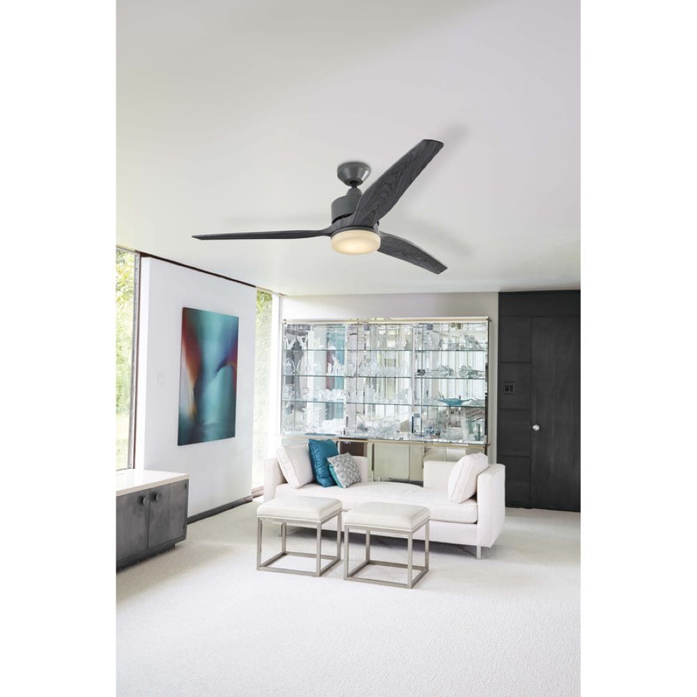 Fairwind’s sculpted three-blade silhouette slices through space with effortless grace, imparting a refined industrial note. The galvanized body contrasts beautifully with the gray wood blades and a soft frosted lens that glows like sea glass. Float it above a linen sectional or on a breezy covered patio, and layer in matte black accents for tension and polish. It’s a quiet luxury essential—form and function in perfect equilibrium.