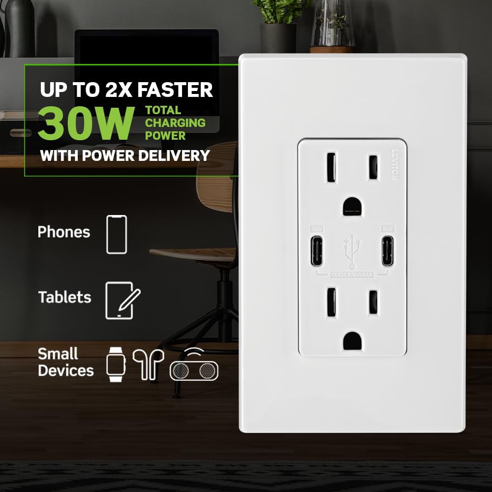 Upgrade any room with Leviton’s T5635-W: a tamper‑resistant duplex outlet paired with dual USB‑C ports delivering up to 30W Power Delivery on a single port. Smart chip technology optimizes charging for phones, tablets, and laptops while integrated safety features help prevent overheating and overcurrent.