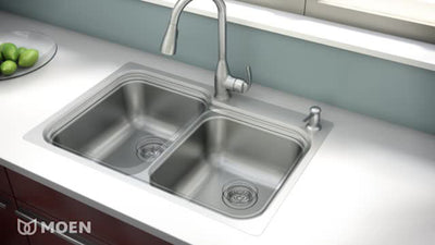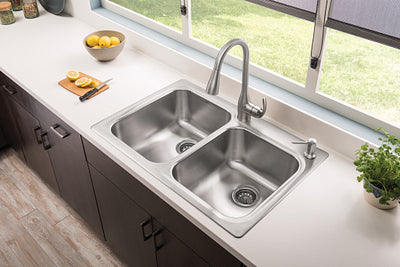 An all-in-one dual-mount kitchen sink and faucet combo built from durable 18-gauge stainless steel. Features SoundSHIELD noise reduction, equal double bowls, and a Spot Resist stainless pull-down faucet with soap dispenser for a clean, quiet, and convenient workspace.