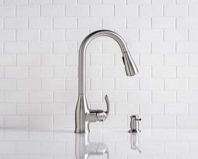 Complete Kit: Includes Spot Resist stainless pull-down faucet, coordinating soap dispenser, 2 strainers, and template