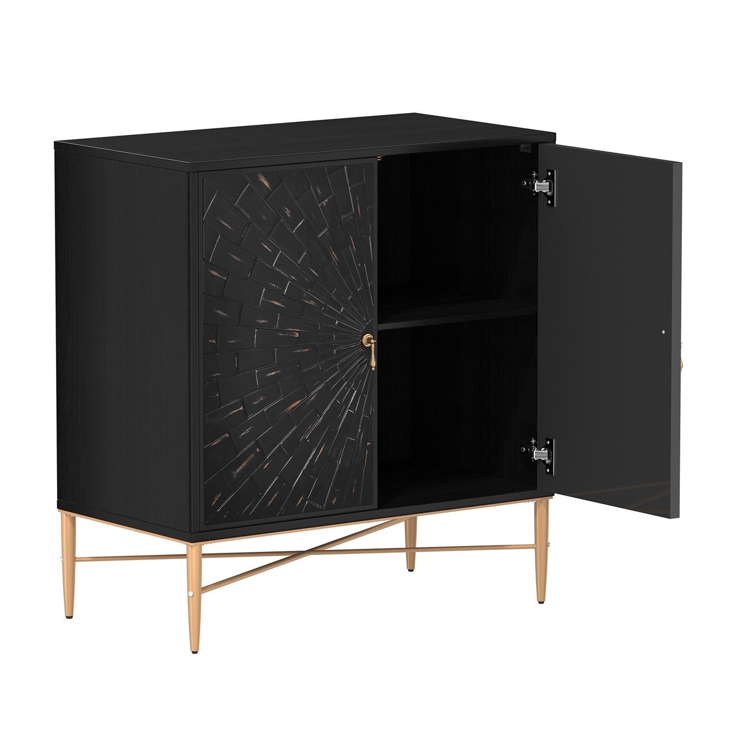 Elevate your space with the Mondawe 30" Vintage Accent Cabinet, a perfect fusion of vintage charm and modern industrial flair. Hand-painted and intricately carved, its geometric patterns and striking black finish create a visually stunning piece with versatile storage options, making it ideal for any stylish home.