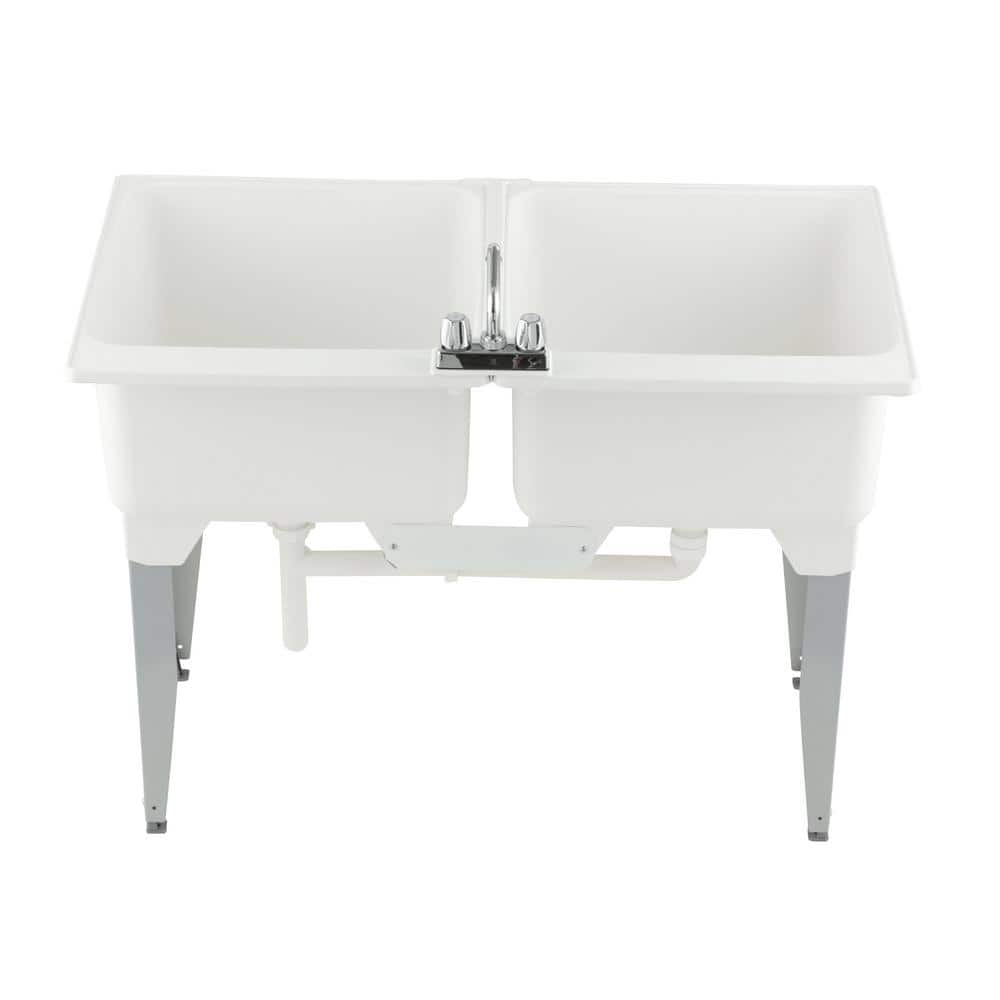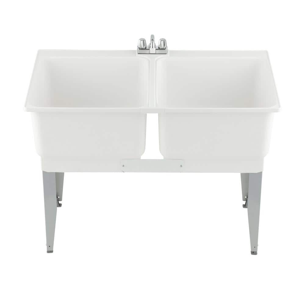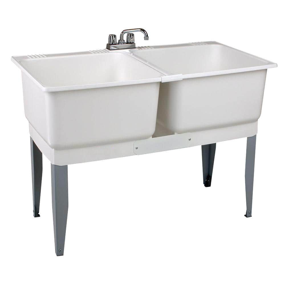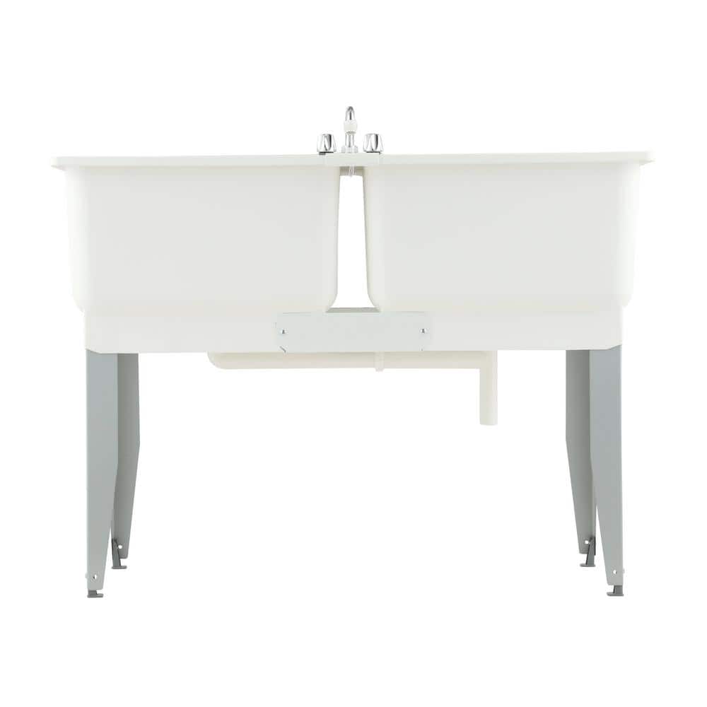 Imagine transforming your ordinary laundry room into a serene workspace with the MUSTEE 46 in. x 34 in. Plastic Laundry Tub. This double basin marvel is not just functional—it brings a sleek, industrial flair to your home. Its robust, freestanding design invites possibilities, seamlessly blending practicality with design elegance. Style it with soft lighting and warm tones for a harmonious balance that makes laundry day a luxurious escape. This tub is more than just a utility sink; it's a statement of enduring quality, vital for a refined, efficient living environment.