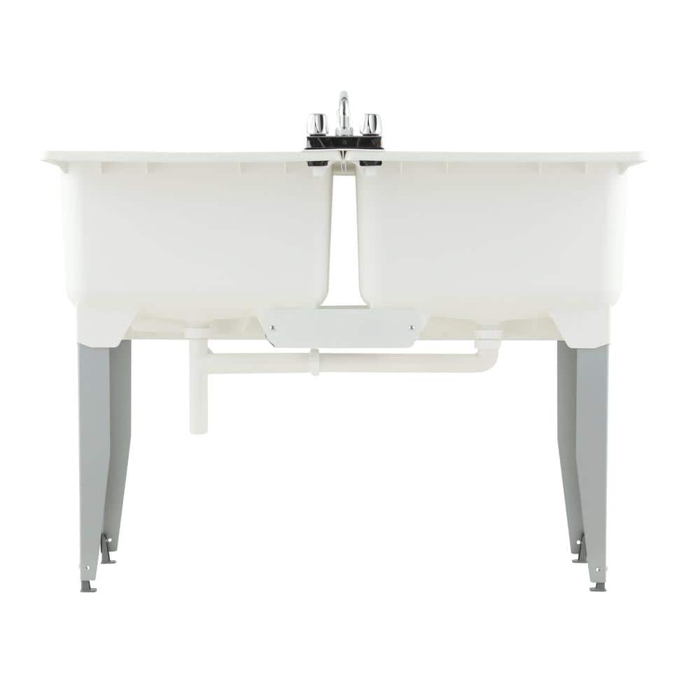 The MUSTEE 46 in. x 34 in. Plastic Laundry Tub is an essential addition to any utility or laundry room. Designed for heavy-duty use, it boasts rust-proof polypropylene construction, adjustable levelers, and dual 20-gallon basins. Easy installation and included accessories make it a reliable choice for professionals and DIY enthusiasts alike.