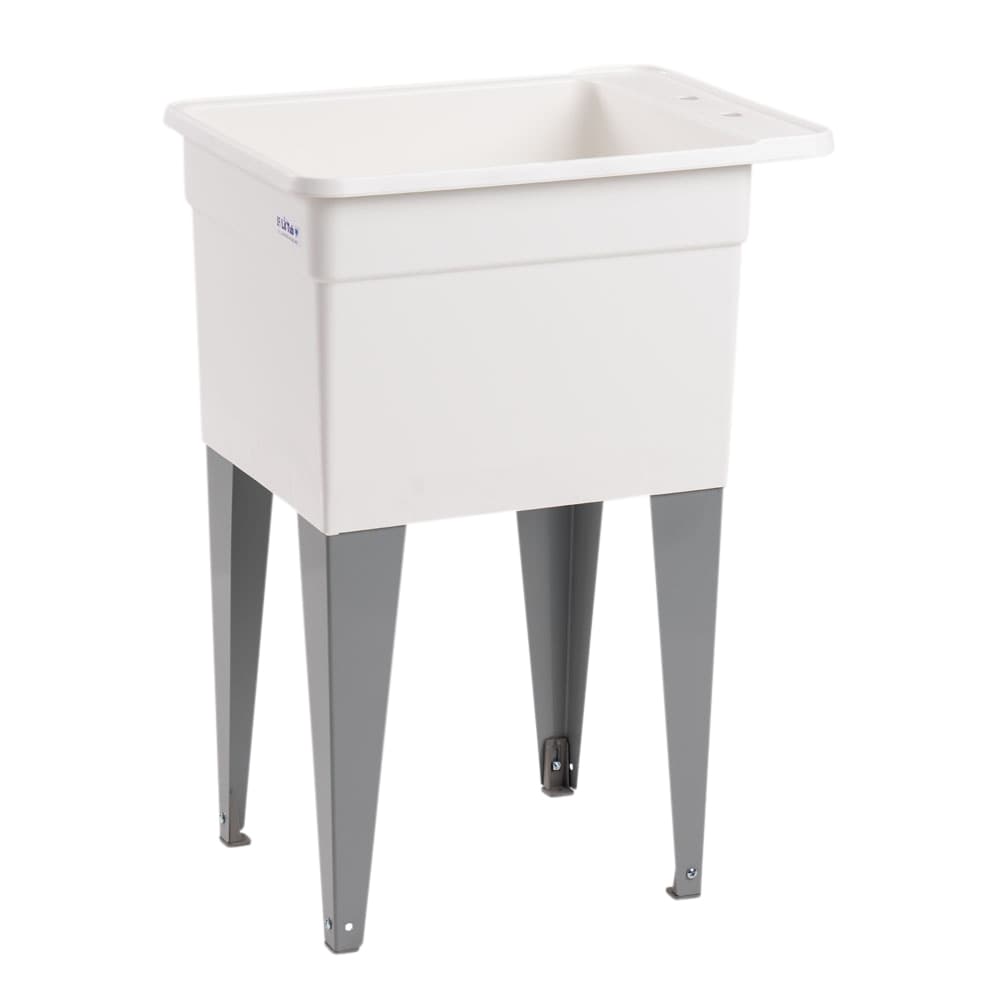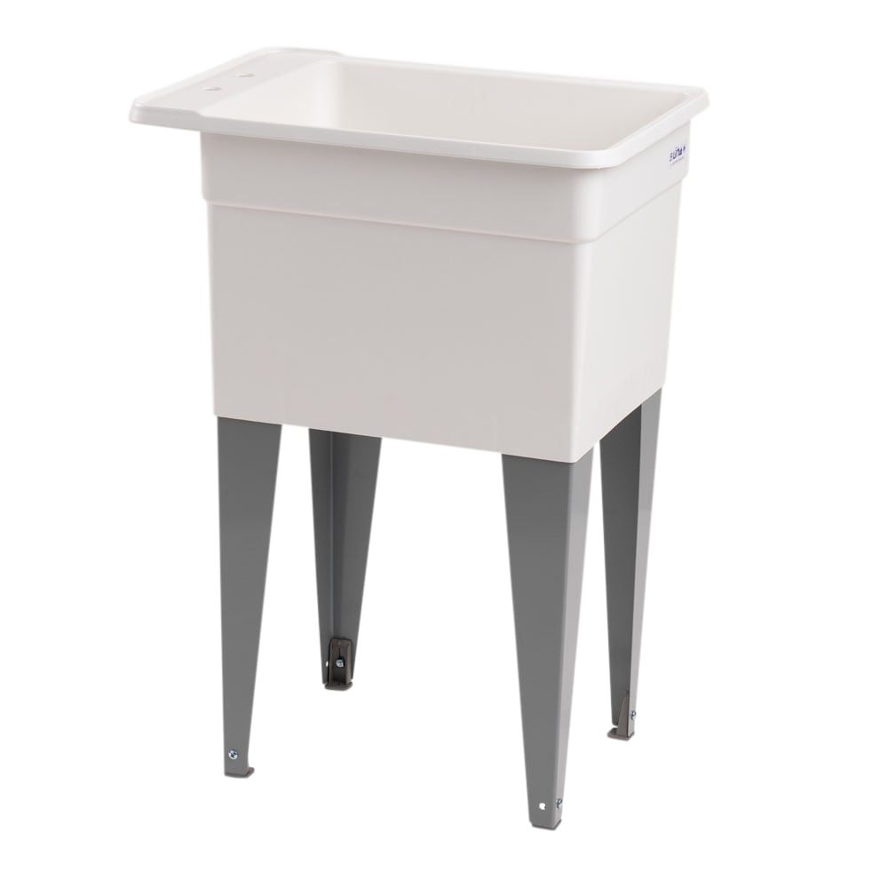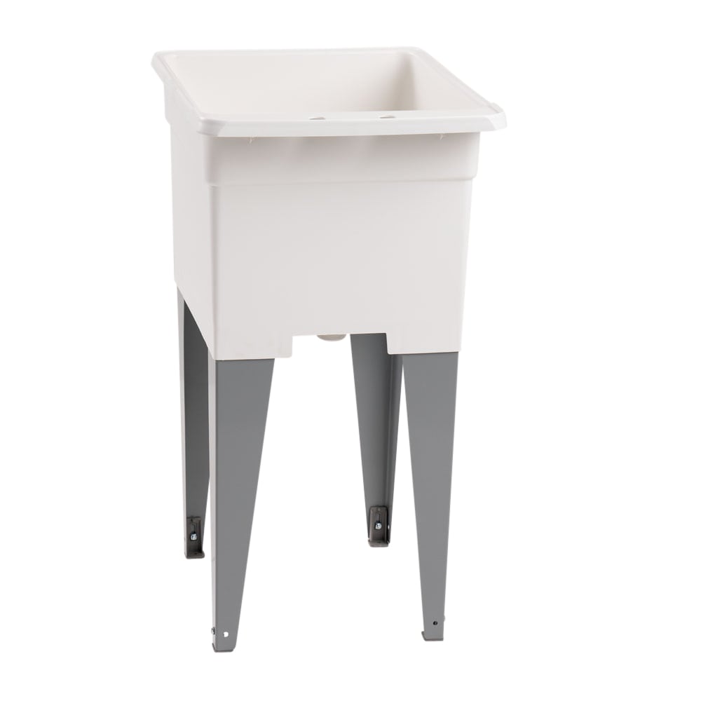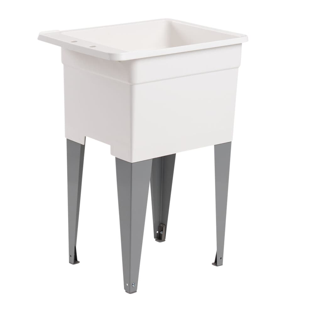 Elevate the elegance of your utility spaces with this Mustee Freestanding Utility Tub. Its pristine white finish and chic gray legs create a harmonious blend of function and style, transforming mundane chores into delightful experiences. Style it alongside sleek metallic fixtures and vibrant indoor plants to craft an inviting launderette or mudroom. Embrace this utility tub as a symbol of practicality wrapped in understated luxury.