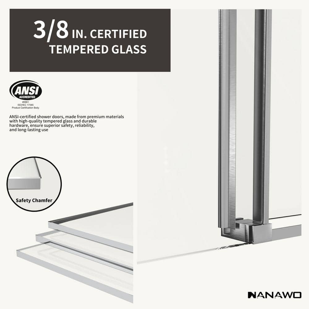 Q: Is the glass in this shower door shatterproof? A: The 3/8 inch tempered glass is ANSI certified, providing excellent durability and resistance to impacts.