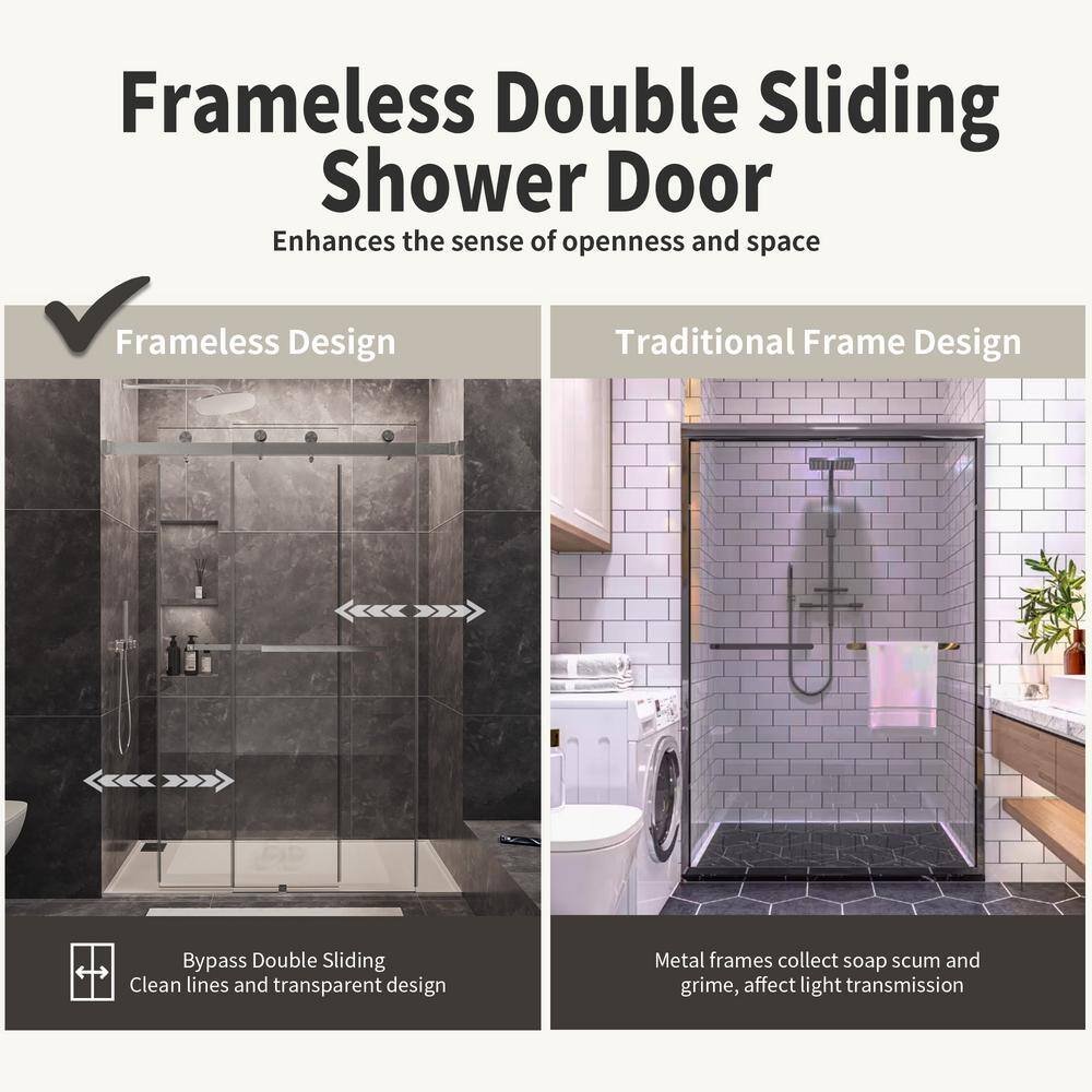The NANAWO 66x76 sliding frameless shower door combines sleek, modern design with impeccable functionality. Featuring robust 3/8 inch tempered glass and brushed nickel hardware, this door guarantees durability and elegance. Its double sliding panels offer flexible access, transforming your bathroom into a sophisticated sanctuary.