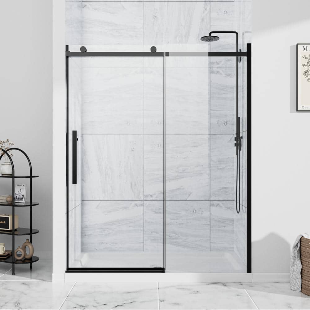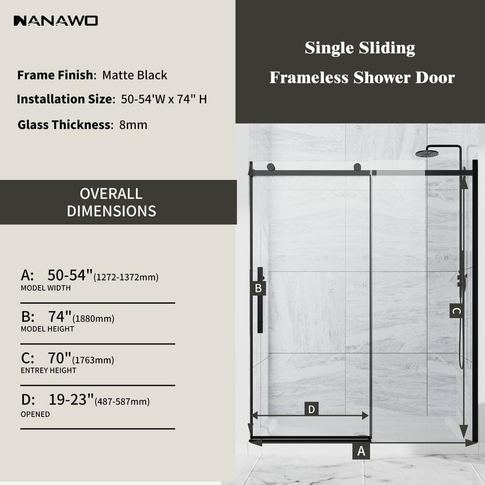 NANAWO Obsidian 54 in. W x 74 in. H Single Sliding Frameless Shower Door in Matt Black with Clear 5/16 in. Glass