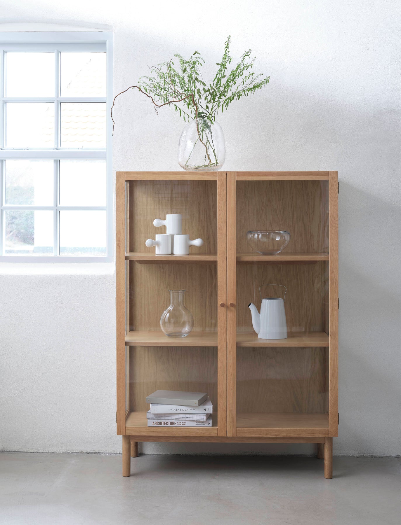 Experience the refined elegance of the Natural Oak Wood Media Cabinet, crafted to infuse any space with modern sophistication. Skillfully designed in Denmark, it combines durable oak wood with transparent glass doors for a contemporary yet timeless allure. Perfect for displaying and organizing your media collection with style.