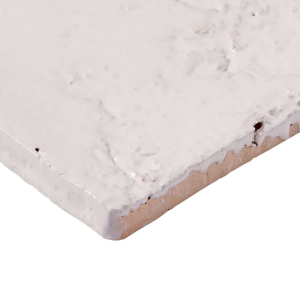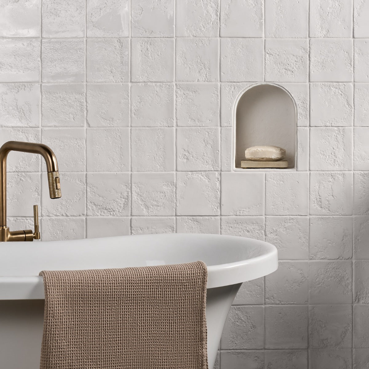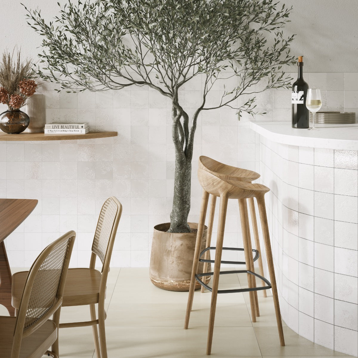 The Navari White 5x5 Textured Glossy Ceramic Tile offers a handcrafted, artisanal look with a polished finish. Perfect for walls in kitchens, bathrooms, and showers, this tile combines rustic charm with modern durability.