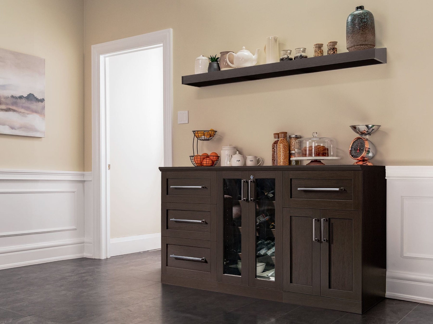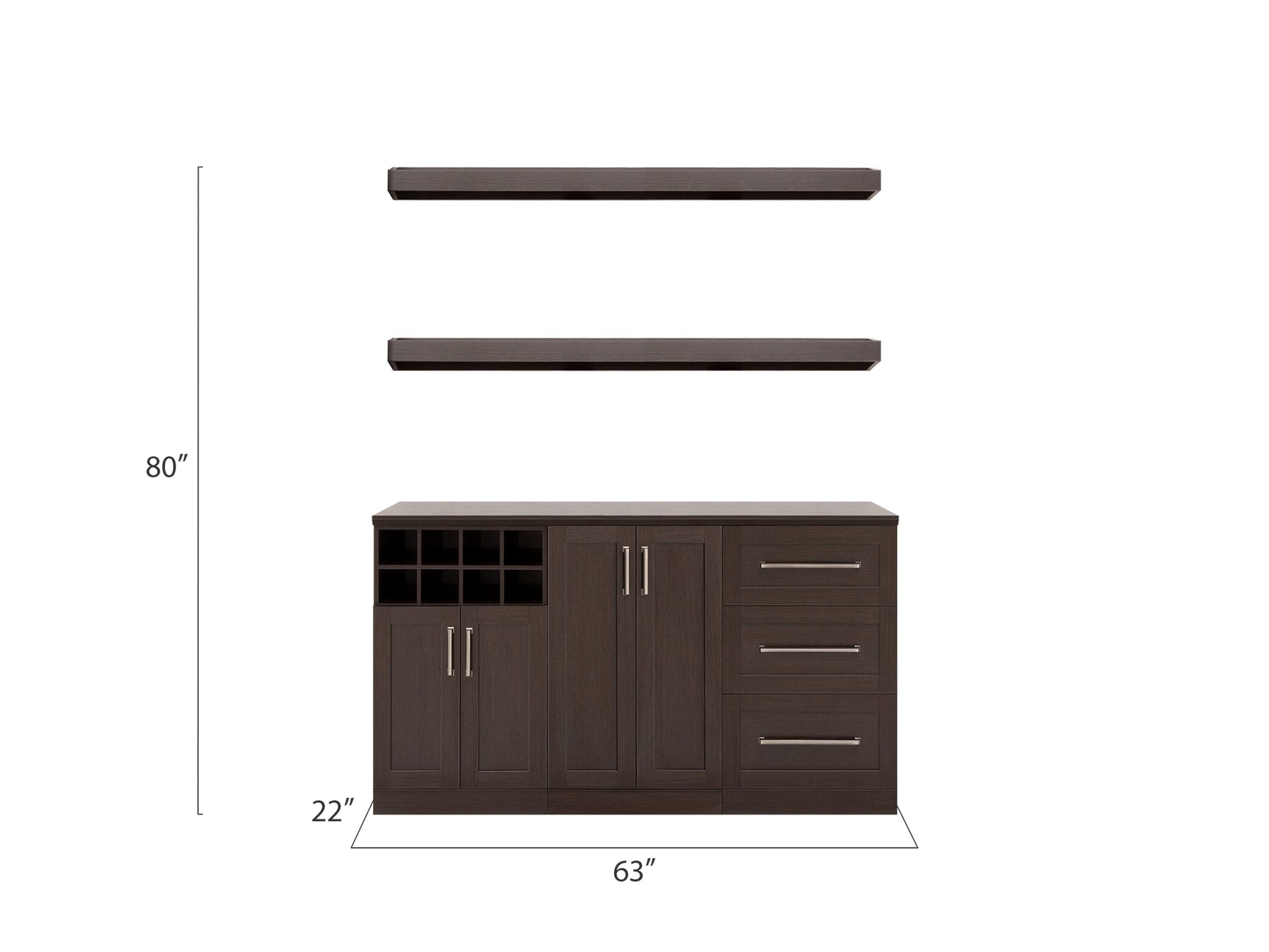 Q: What are the dimensions of the bar cabinet? A: The bar cabinet measures 63 inches wide, 80 inches high, and 22 inches deep.