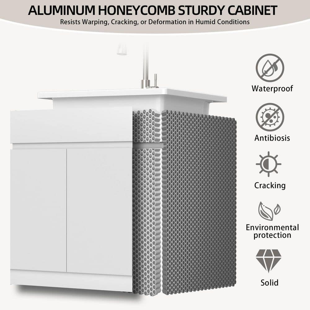 Q: What materials are used for the cabinet? A: The cabinet is crafted from high-quality particle board with a honeycomb core and features a matte white SPC (Stone Plastic Composite) exterior for durability and waterproofing.
