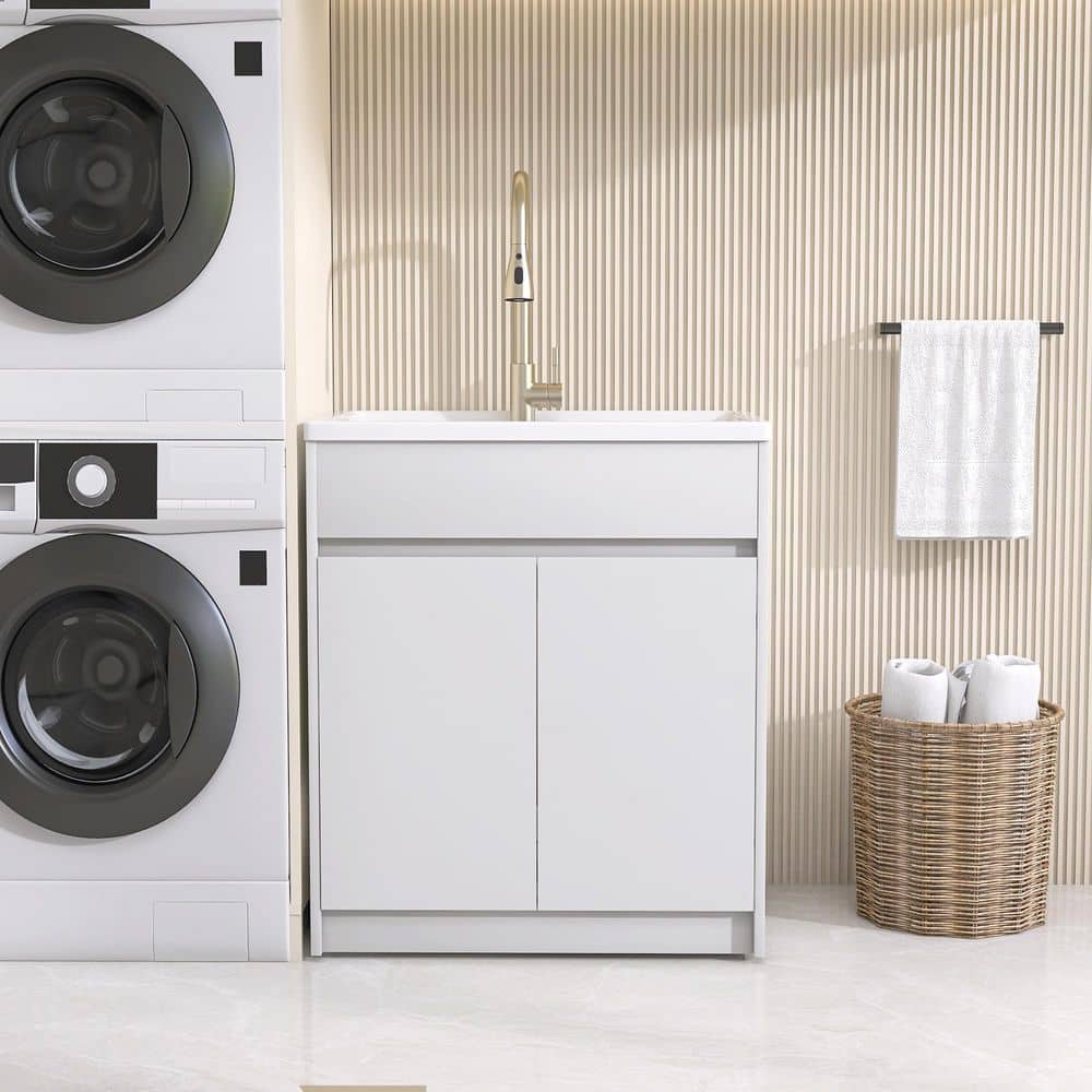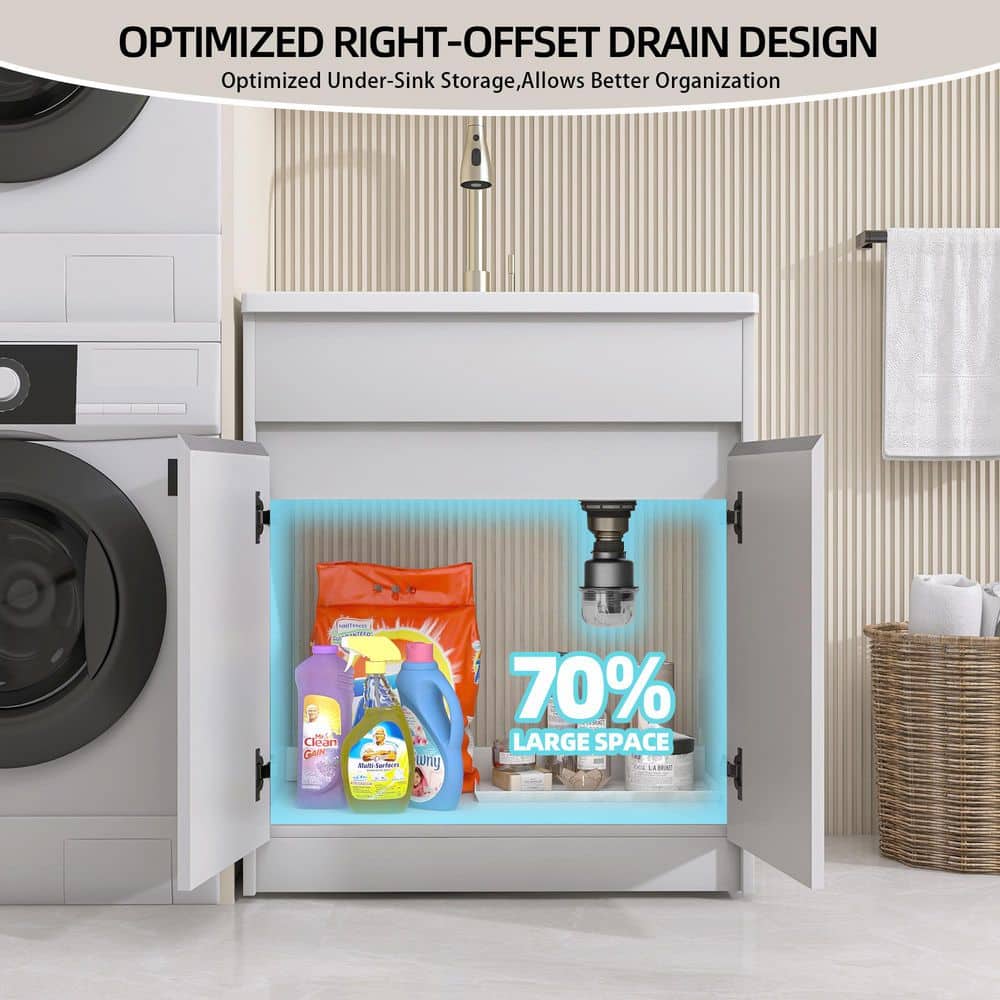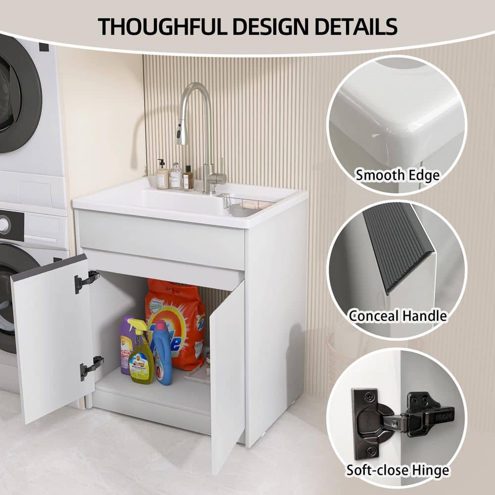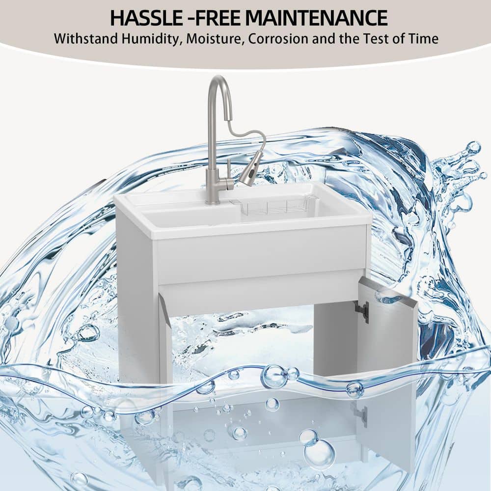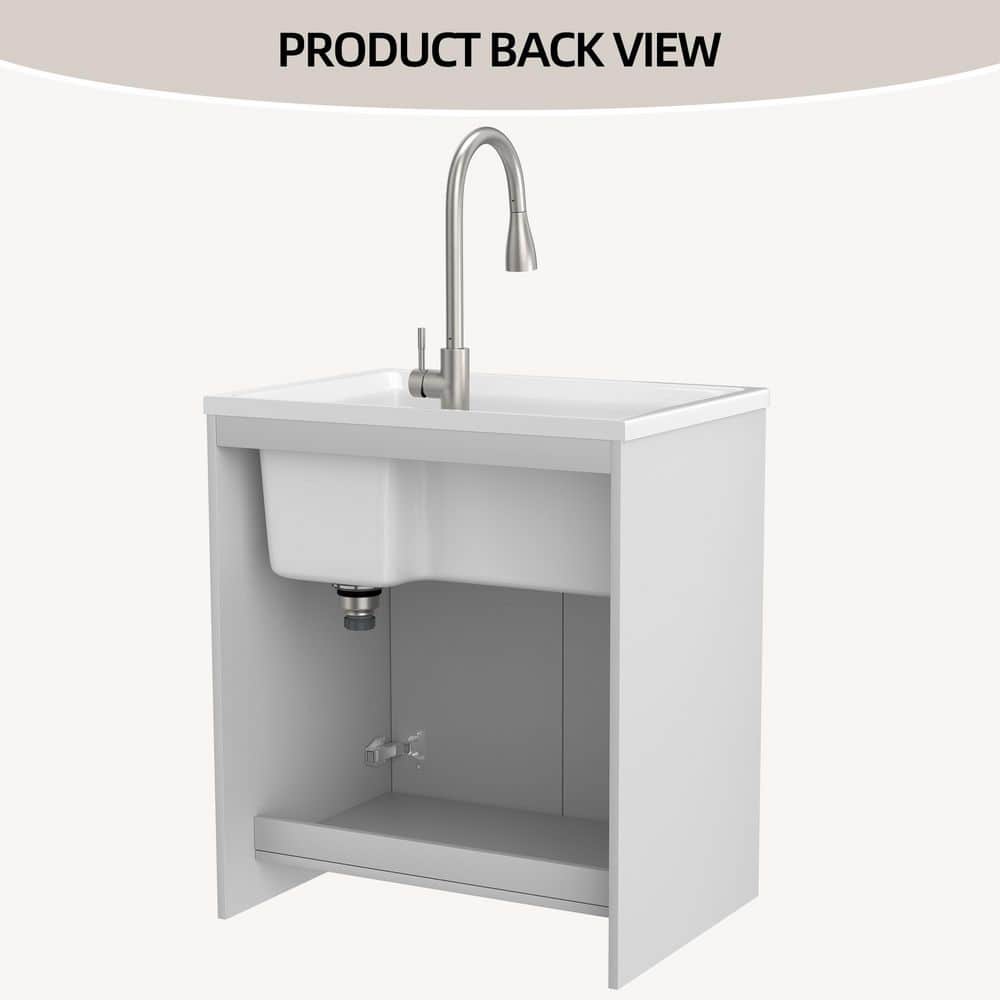 Elevate your laundry or utility room with this stylish NTQ 30 in. solid surface sink and cabinet. Featuring a high arc stainless steel faucet and a modern matte white finish, this functional unit offers robust storage and seamless integration in contemporary settings, making chores and organization effortless.