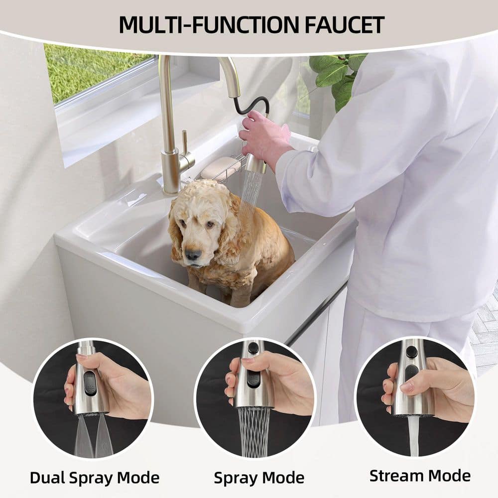 Q: Is the faucet included with the set? A: Yes, the stainless steel utility faucet with flexible supply lines is included, ensuring full functionality upon installation.