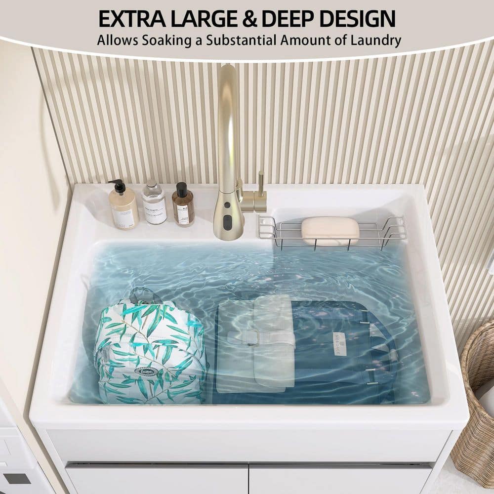 Q: How easy is the installation process? A: The NTQ laundry sink and cabinet come pre-assembled, making installation quick and straightforward. Detailed instructions are included to facilitate an easier setup.