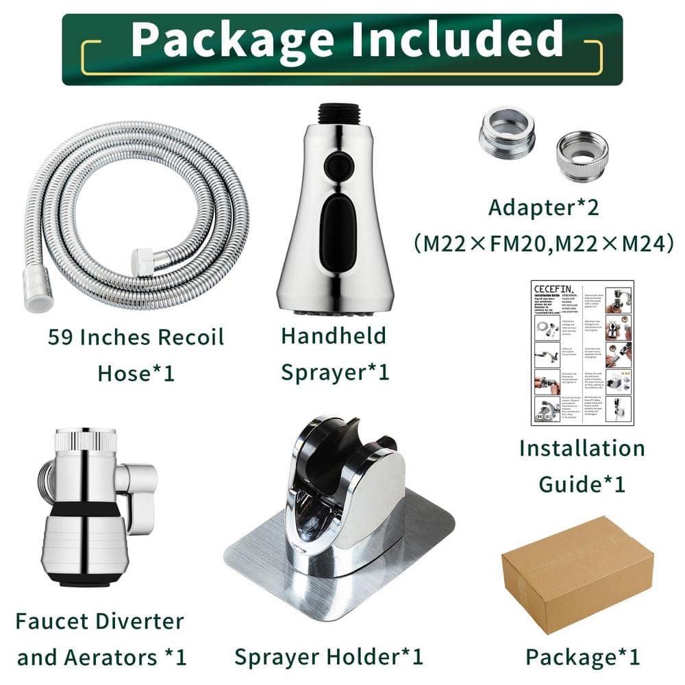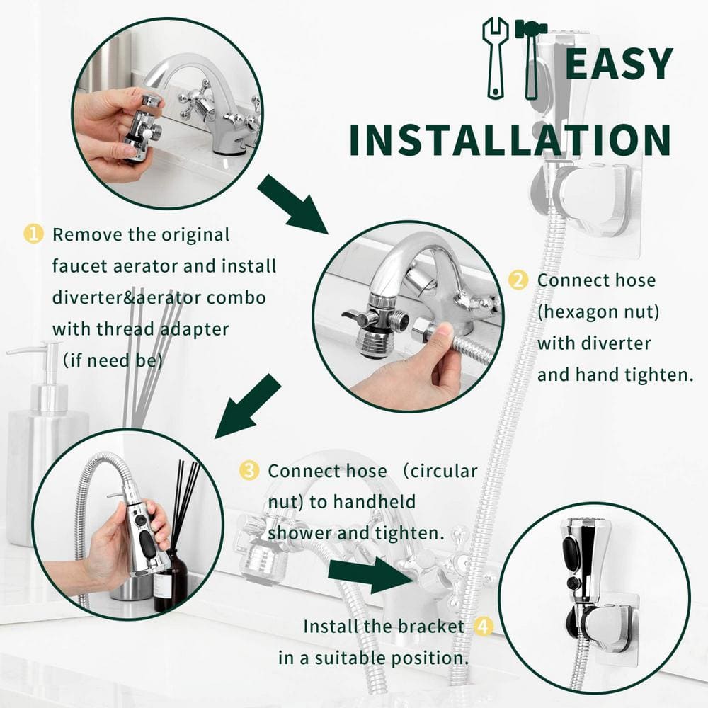 Q: How do I install this sprayer set? A: Installation is straightforward and requires no professional plumber. Simply remove the existing aerator, connect the dual-function aerator to the faucet, and attach the hose and handheld sprayer.