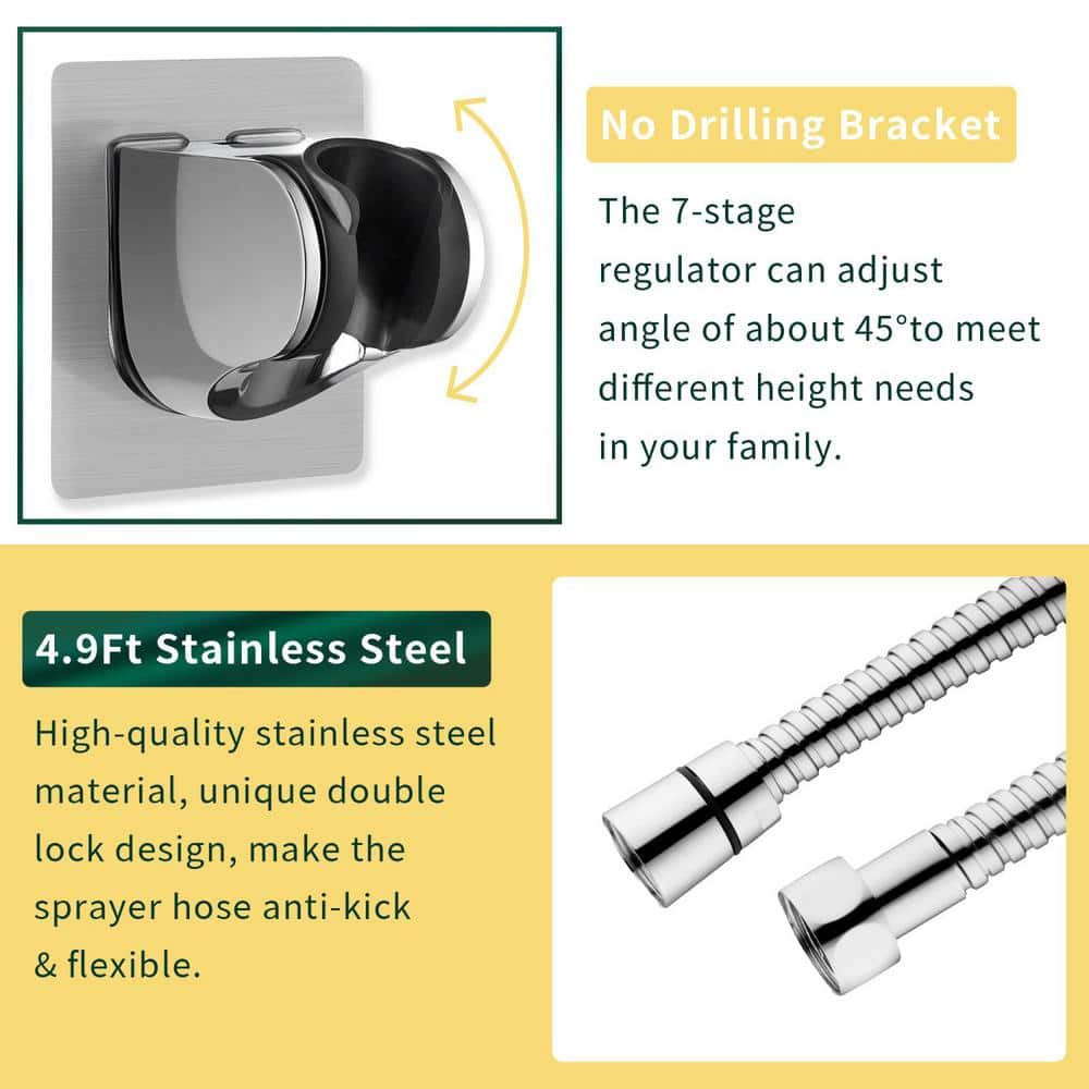 Q: What is the water flow rate of this sprayer set? A: The sprayer set provides a maximum flow rate of 1.8 GPM (6.8 liters per minute) under 80 PSI, which balances performance and water saving.