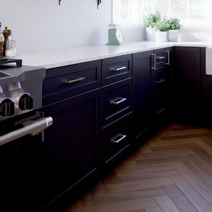 Q: How do I install the Karena drawer pull? A: The Karena drawer pull features a rear-mount installation, requiring two 1-inch screws (included) suitable for door or drawer faces between 5/8-in to 3/4-in thick.