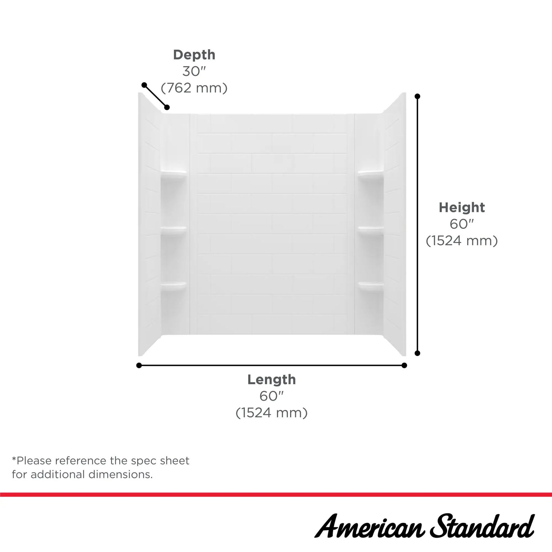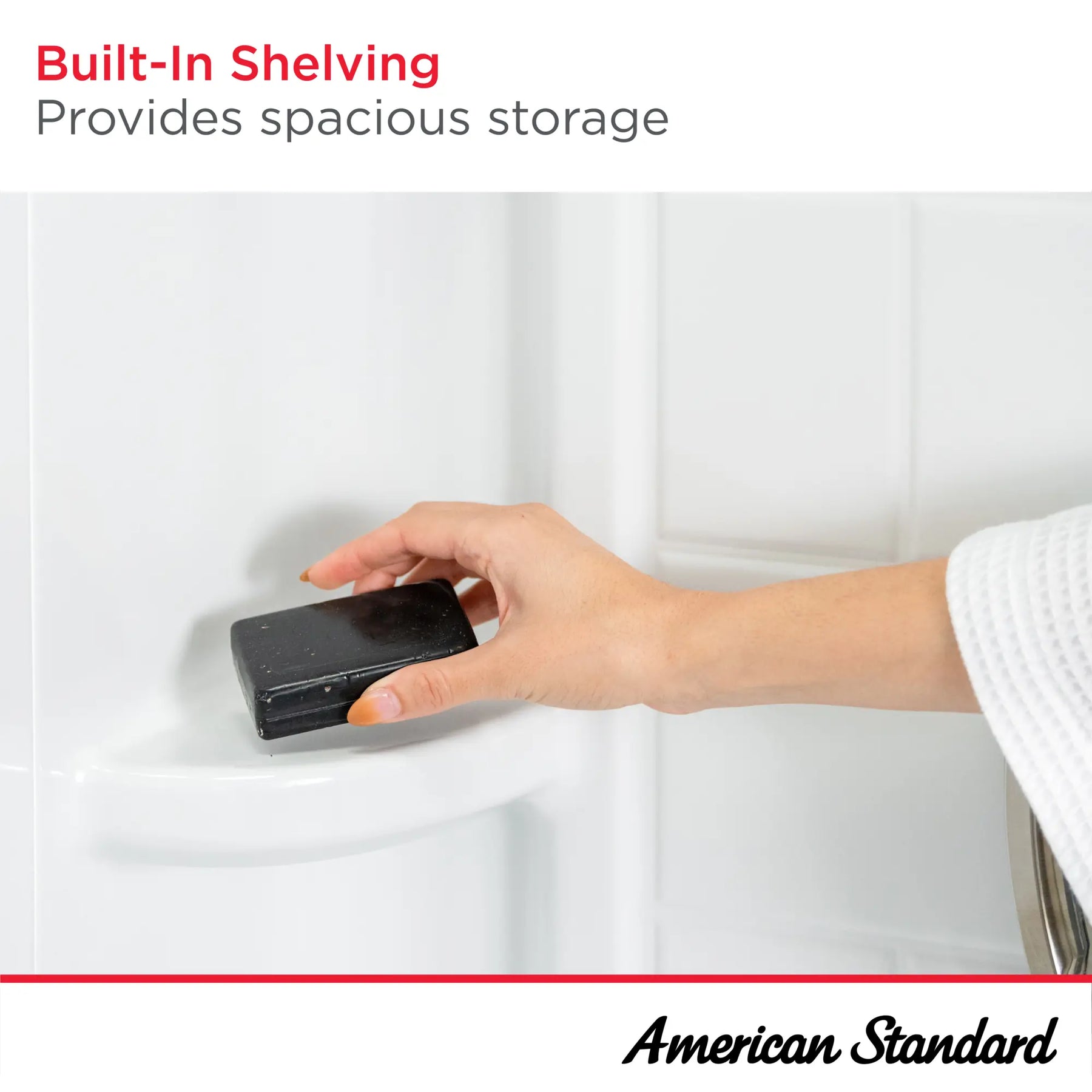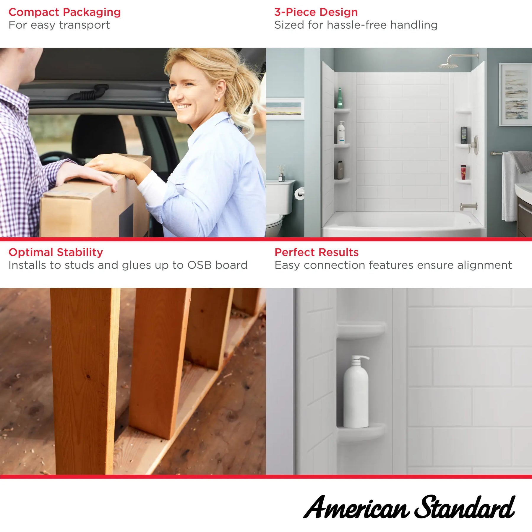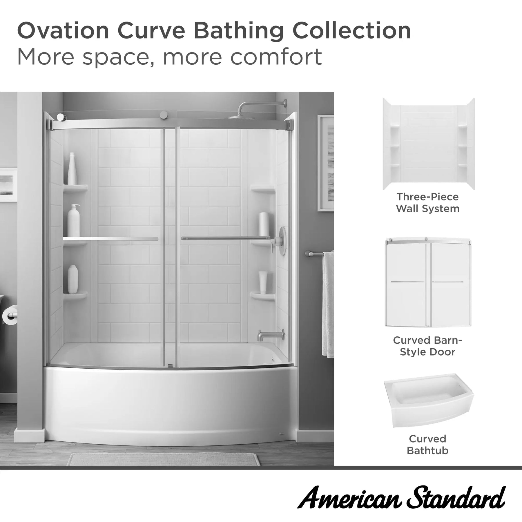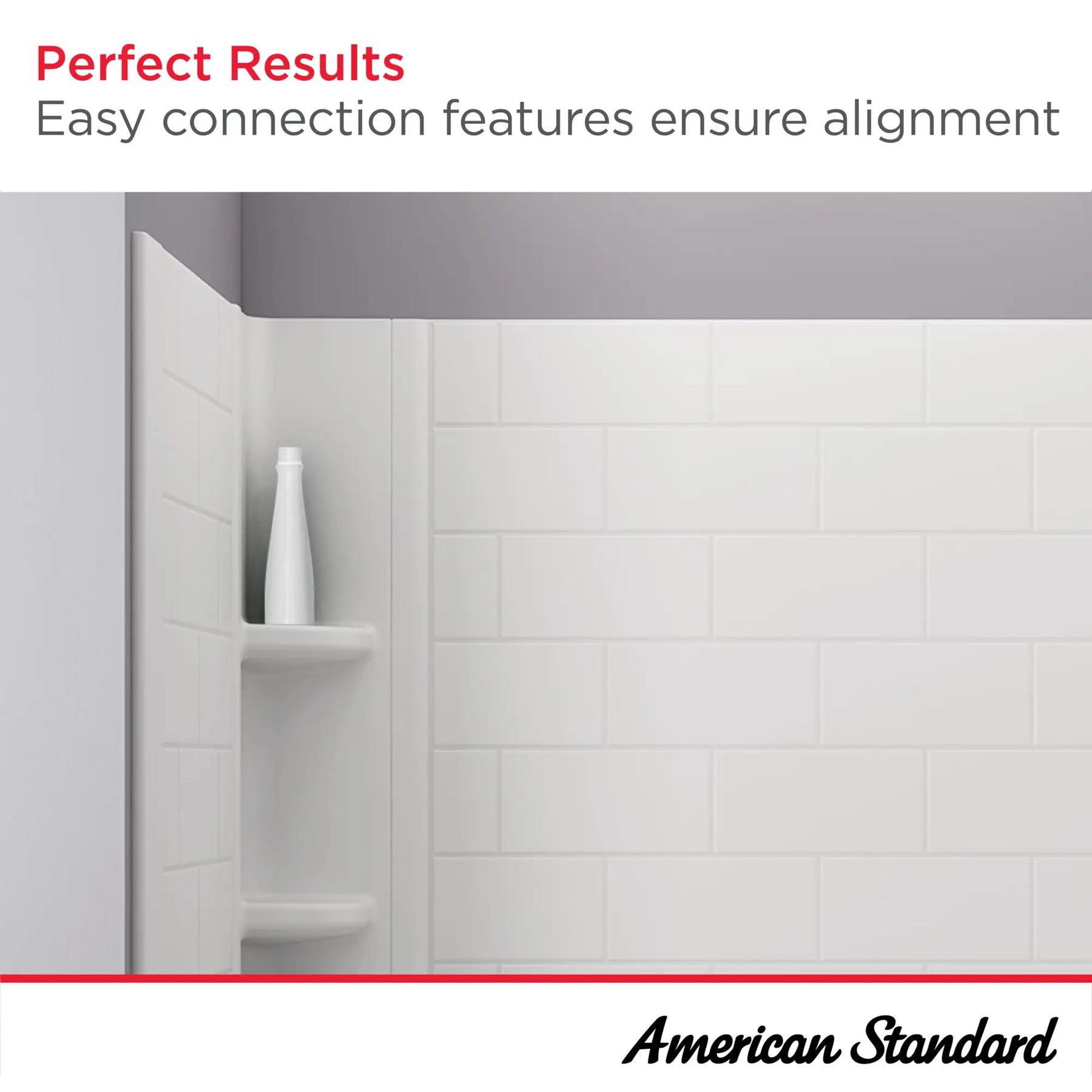 Upgrade your tub alcove with the Ovation Curve 60 x 60 three-piece wall system from American Standard. Featuring a large subway-tile look with no grout to maintain, these glue-up walls install to studs or OSB for a sturdy, aligned fit and include integrated shelving for everyday storage.