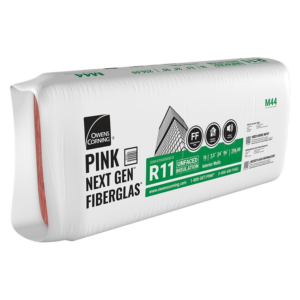 Owens Corning PINK Next Gen Fiberglas R-11 batts deliver fast, clean installation for interior walls. Unfaced batts fit 2x4 cavities, recover quickly, and provide sound attenuation with 256 sq. ft. coverage per bag.