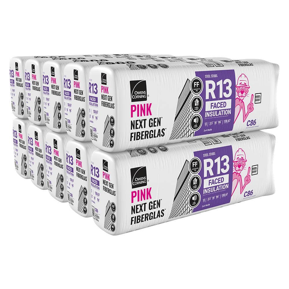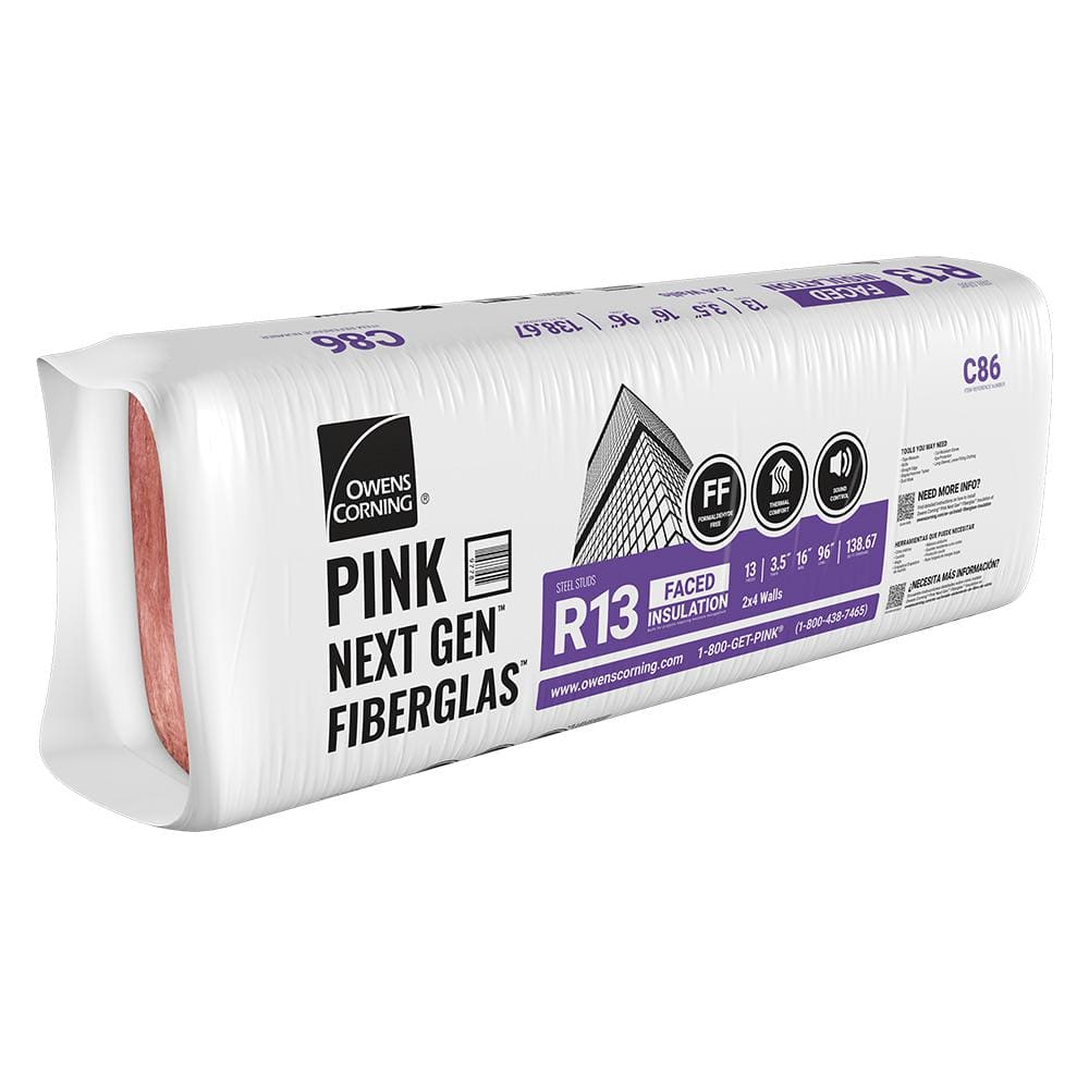 Owens Corning PINK Next Gen Fiberglas R-13 batts deliver reliable thermal and acoustic performance for 2x4 walls. The kraft facing provides a built‑in vapor retarder, while stiffer, shed‑resistant batts install quickly and stay put for clean, professional results.