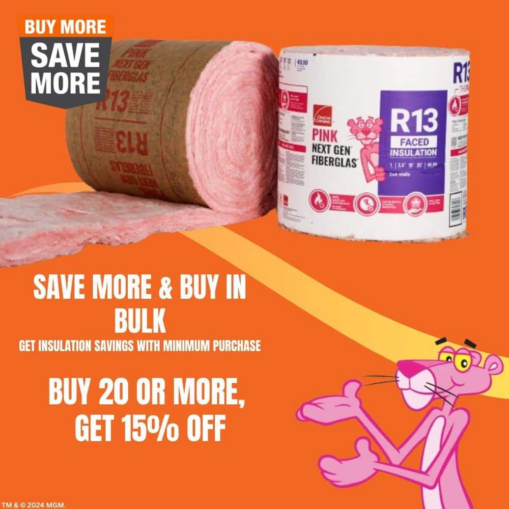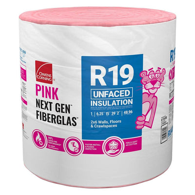 Owens Corning PINK Next Gen Fiberglas R-19 unfaced roll delivers reliable thermal and acoustic performance for 2x6 walls, floors and crawlspaces. Advanced fiber technology installs fast, cuts cleanly, and recovers without fluffing for inspection-ready results.