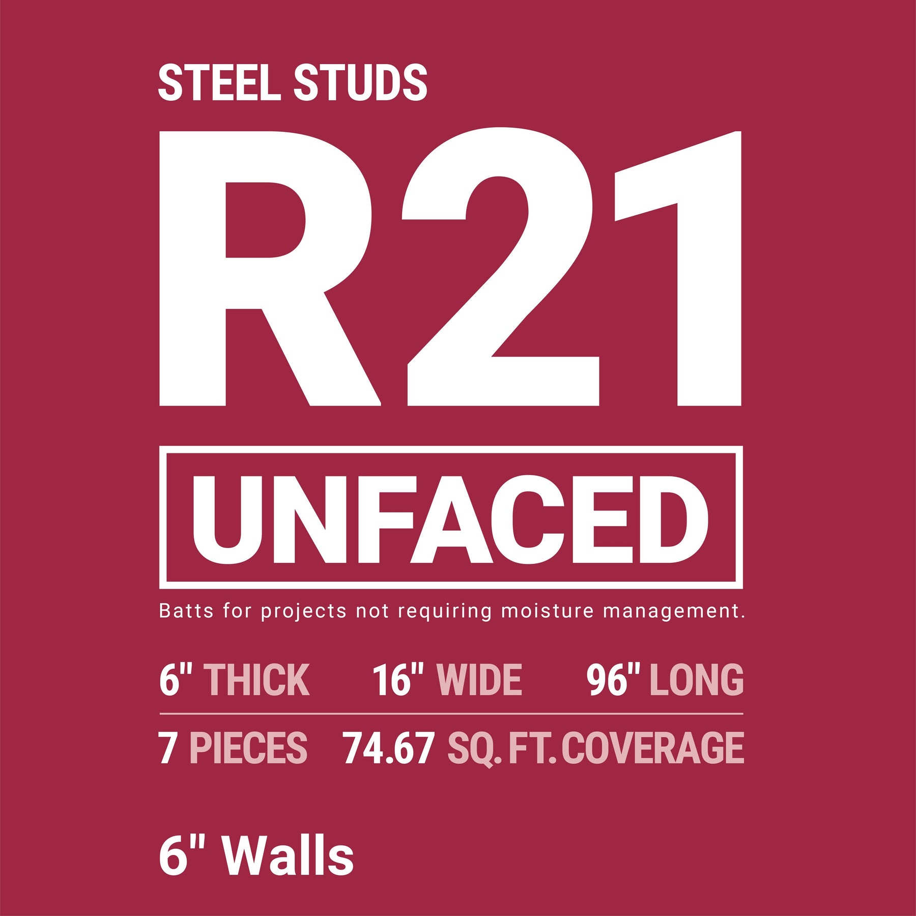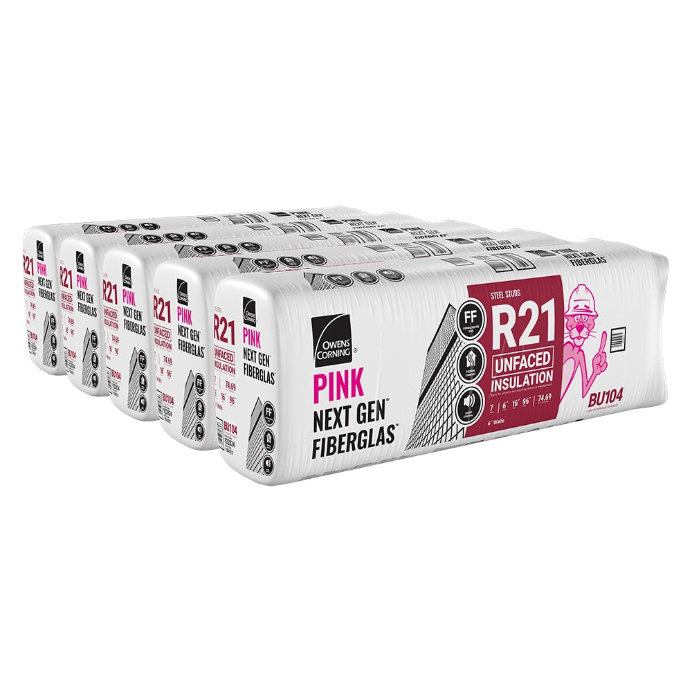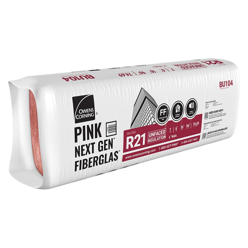 Owens Corning PINK Next Gen Fiberglas R-21 unfaced batts deliver high thermal performance for 2x6 wall cavities. Pre-cut to 16 in. x 96 in., these soft, low-dust batts install quickly and provide 74.69 sq ft of coverage per pack.