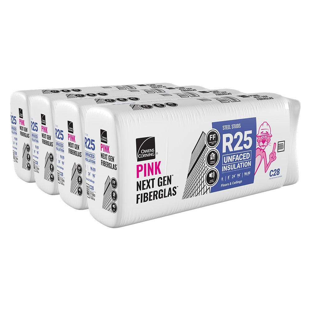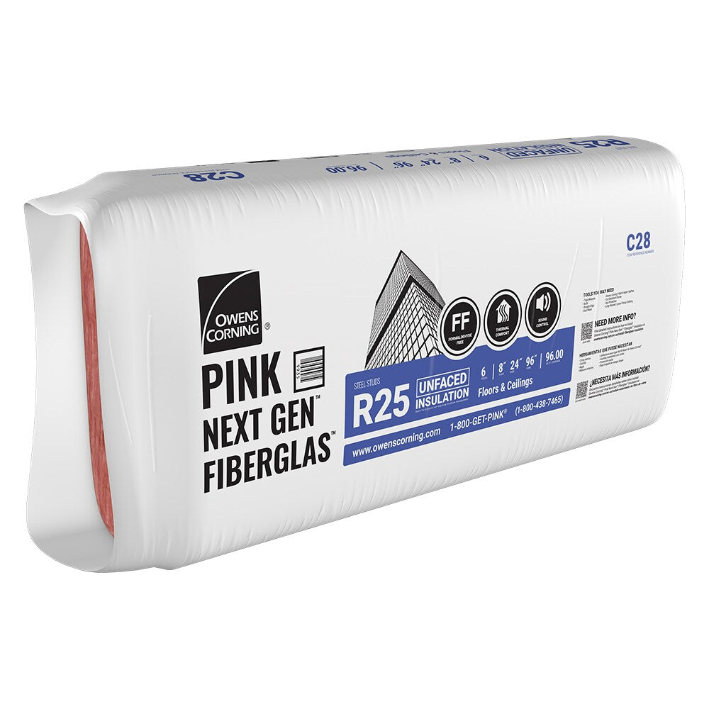 Owens Corning PINK Next Gen Fiberglas R-25 batts deliver high thermal performance and sound reduction for floors and ceilings. The unfaced, 8-in-thick batts fit 24-in-wide cavities and install cleanly with low dust for faster, easier jobs.
