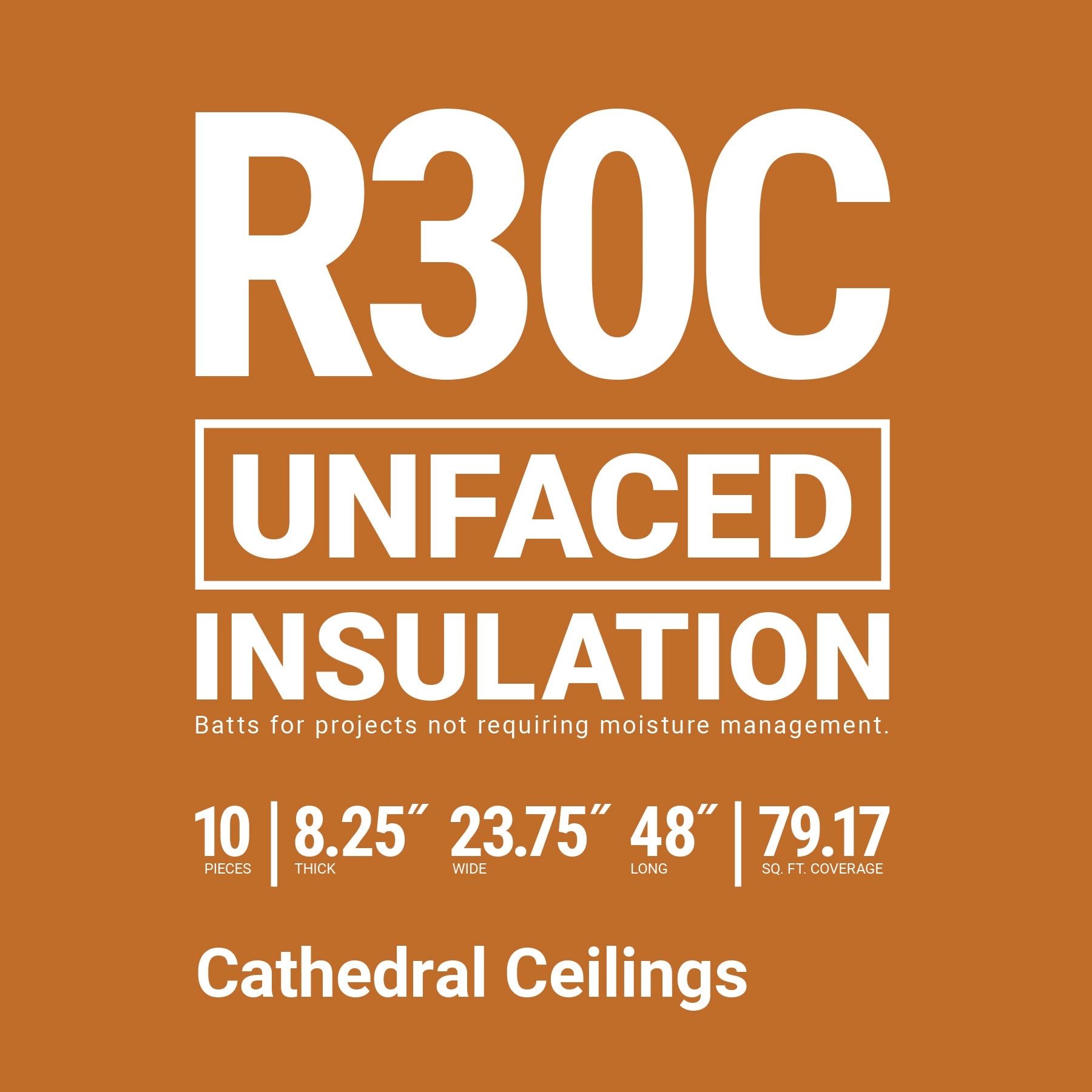 High-performance R-30 unfaced fiberglass batts designed for cathedral ceilings and attic applications. Advanced fiber technology installs fast, recovers instantly, and delivers 79.17 sq. ft. of coverage per pack.