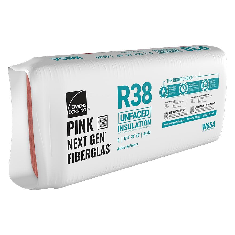 High-performance Owens Corning PINK Next Gen Fiberglas batts deliver R-38 thermal protection for attics and floors. Unfaced, shed-resistant fibers install cleanly, recover quickly, and stay put for inspection-ready results with 64 sq. ft. coverage per bag.