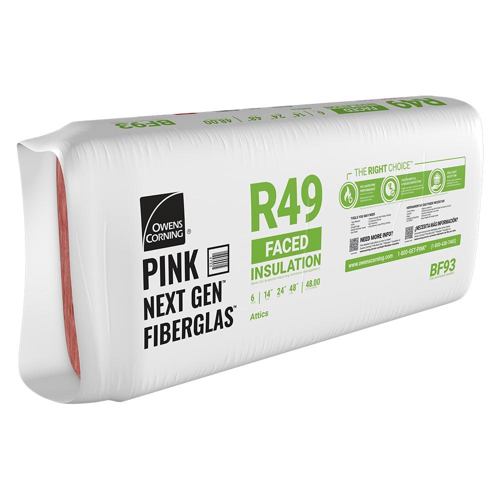 High R-49 attic insulation batts from Owens Corning deliver strong thermal performance and sound control. Kraft facing simplifies installation while PINK Next Gen Fiberglas is formaldehyde-free and soft to the touch. Sized for 24 in. x 48 in. coverage to meet attic code with a single batt.