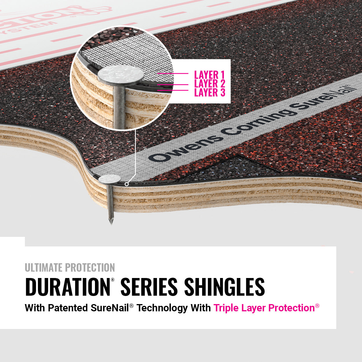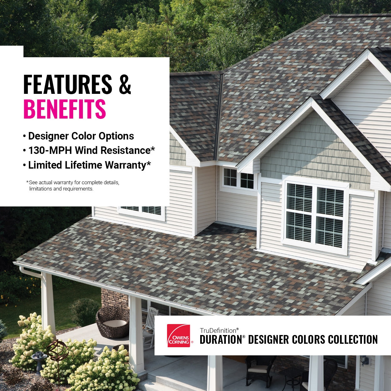 Upgrade curb appeal and protection with Owens Corning TruDefinition Duration Designer shingles in Sand Dune. These laminated asphalt shingles feature patented SureNail Technology for superior holding power and StreakGuard algae resistance to help prevent black streaks.