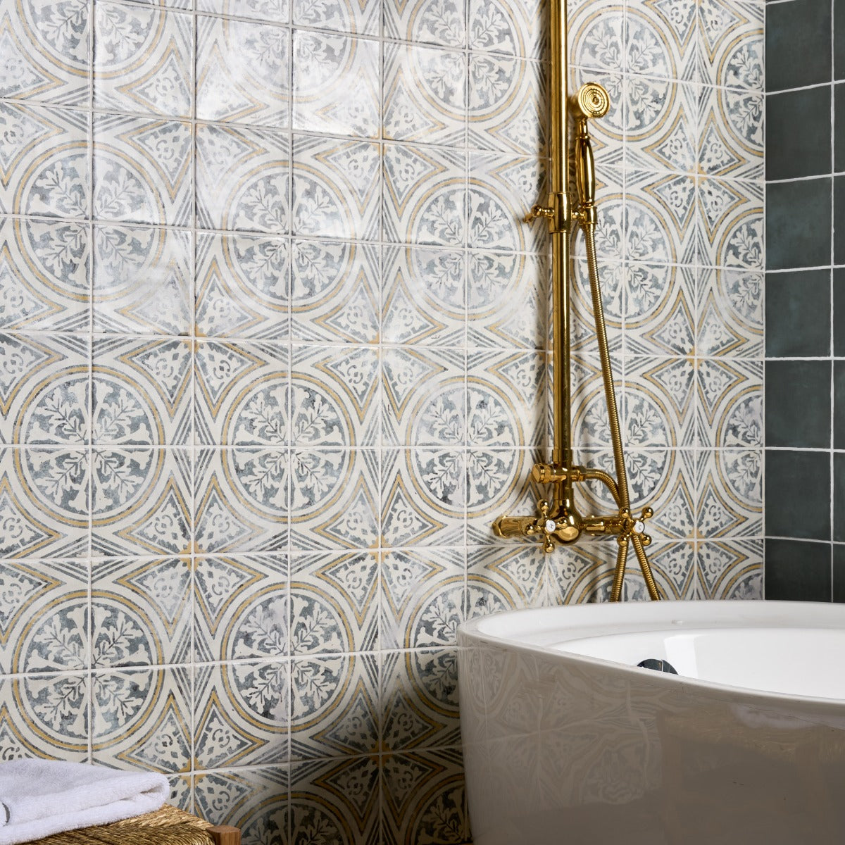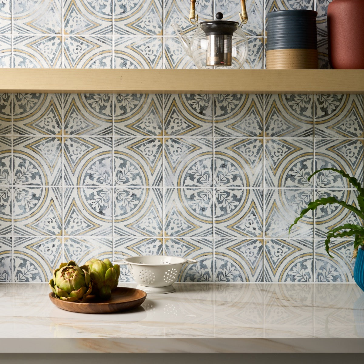 The Talia Agusti Blue Gray Tile by Paula Purroy combines old-world charm with modern sophistication. Featuring a matte encaustic look and vibrant colorways, this tile is perfect for backsplashes, bathrooms, and kitchen walls.