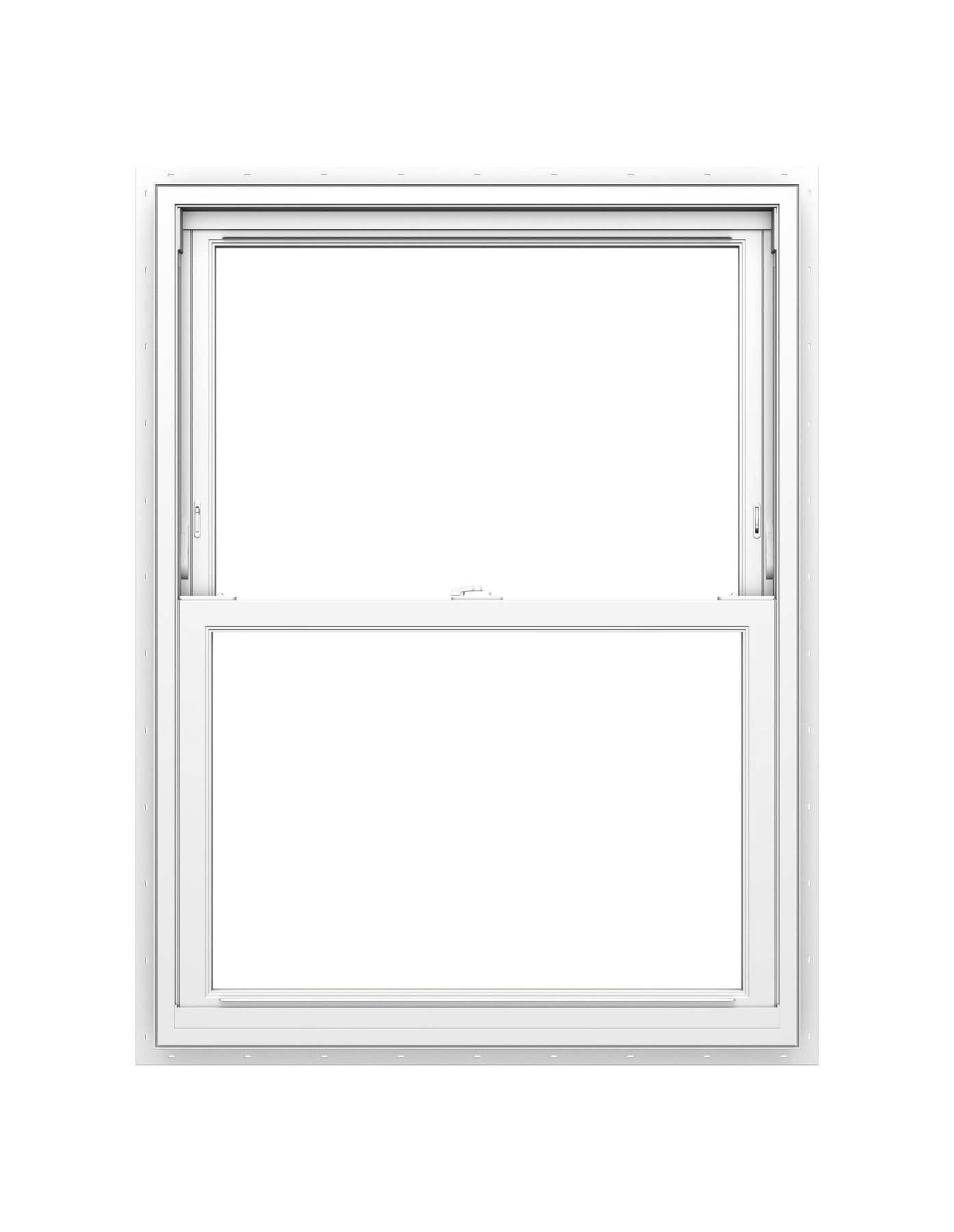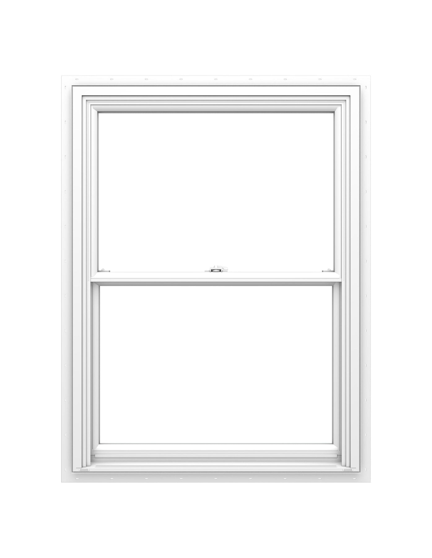 Durable Pella 150 Series vinyl double-hung window for new construction with Low‑E argon double-pane glass for energy efficiency. Clean white finish, integrated nail fin, and full high-transparency screen included.